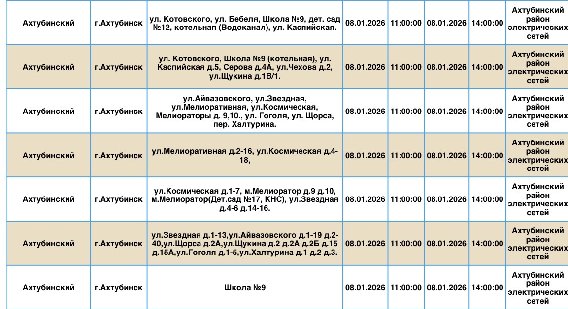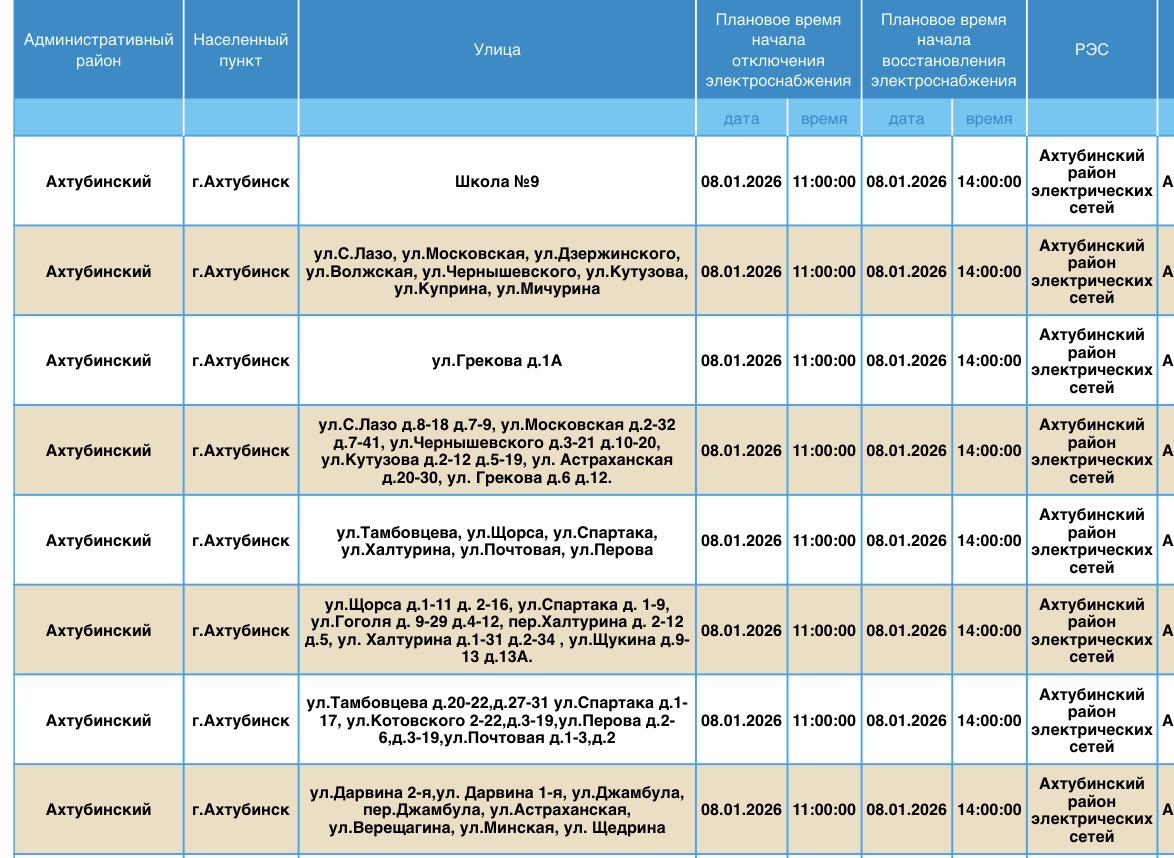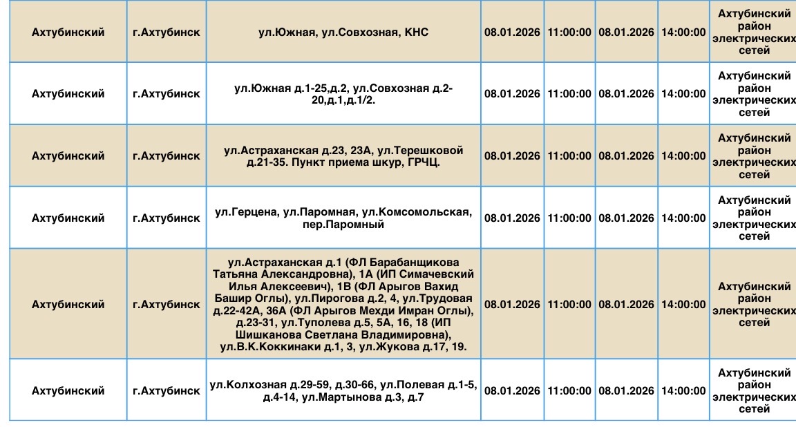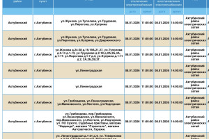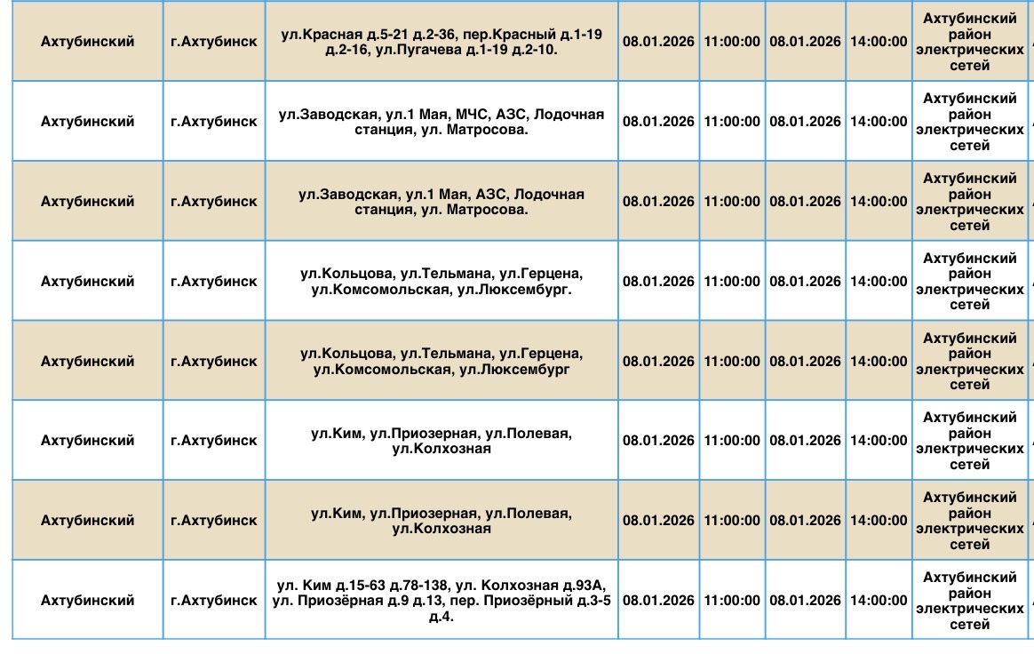 В пресс-службе ПАО «Россети Юг» сообщили о плановых отключениях электроэнергии, которые пройдут в регионе уже завтра, 8 января. Электричества не будет в Ахтубинском районе области. Без света останутся жилые дома, магазины, пункт приема шкур, церковь, библиотека и многое другое. Подробности ниже: Напоминаем, что оперативную информацию о проблемах с электроэнергией, водой и другими коммунальными услугами проще всего отслеживать на интерактивной городской карте. Если же сбои случились неожиданно, сообщайте по приведенным далее контактным телефонам: