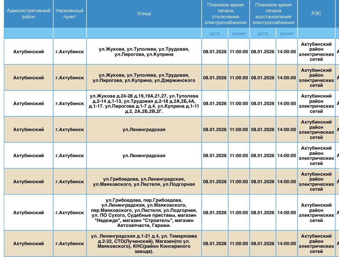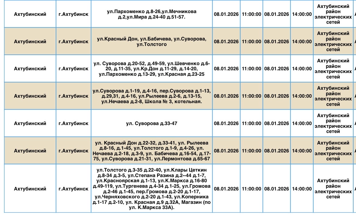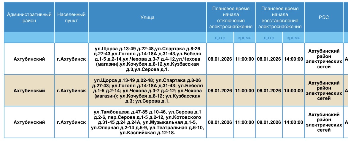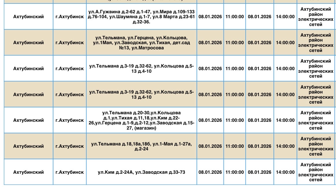 В пресс-службе ПАО «Россети Юг» сообщили о плановых отключениях электроэнергии, которые пройдут в регионе уже завтра, 8 января. Электричества не будет в Ахтубинском районе области. Без света останутся жилые дома, магазины, пункт приема шкур, церковь, библиотека и многое другое. Подробности ниже: Напоминаем, что оперативную информацию о проблемах с электроэнергией, водой и другими коммунальными услугами проще всего отслеживать на интерактивной городской карте. Если же сбои случились неожиданно, сообщайте по приведенным далее контактным телефонам: