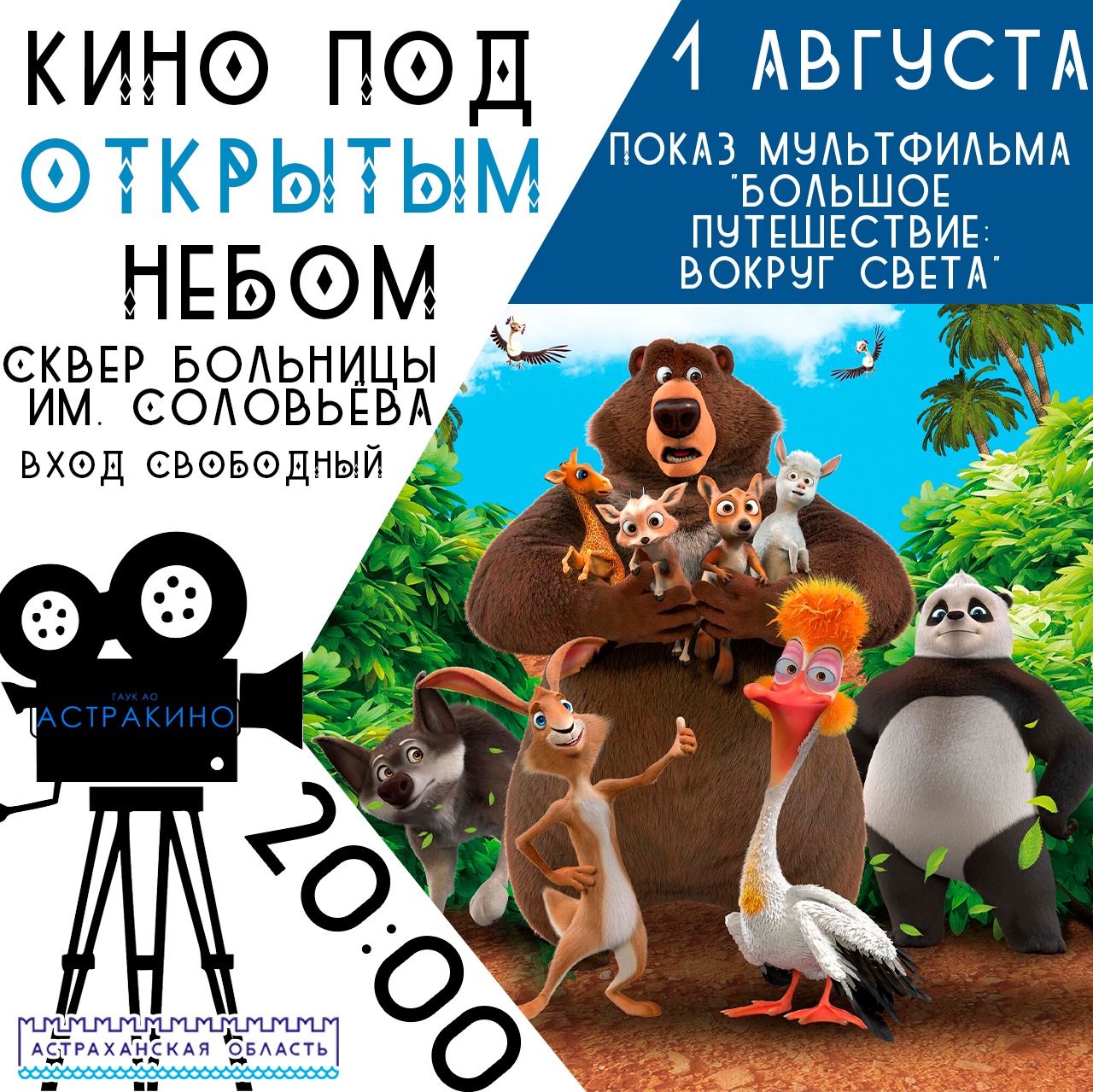 12+. Сезон кинопоказов под открытым небом продолжается. Еженедельно по пятницам в 20:00 на Набережной Волги в сквере больницы Соловьева демонстрируются лучшие отечественные фильмы в рамках проекта «Загружай лето». Очередной показ кино состоится 1 августа в 20:00. Для семейного просмотра астраханцам будет представлен анимационный полнометражный фильм «Большое путешествие. Вокруг света» (Россия, 2024 год), режиссер Василий Ровенский. Это продолжение невероятных приключений медведя Мик-Мика, зайца Оскара, волка Януса и их друзей. Перед началом фильма всех гостей ждут на веселом кино-квизе «Путешествуй вместе с кино». Вход свободный, предварительная запись не требуется. А в субботу, 2 августа, в 18:00 на набережной реки Волги, рядом с памятником Петру I, в рамках проекта «Загружай лето», вновь пройдет мероприятие под названием «Русские вечерки». Для жителей и гостей города подготовлена насыщенная программа, включающая в себя песни и танцы. В Астрахани продолжаются «Русские вечерки»