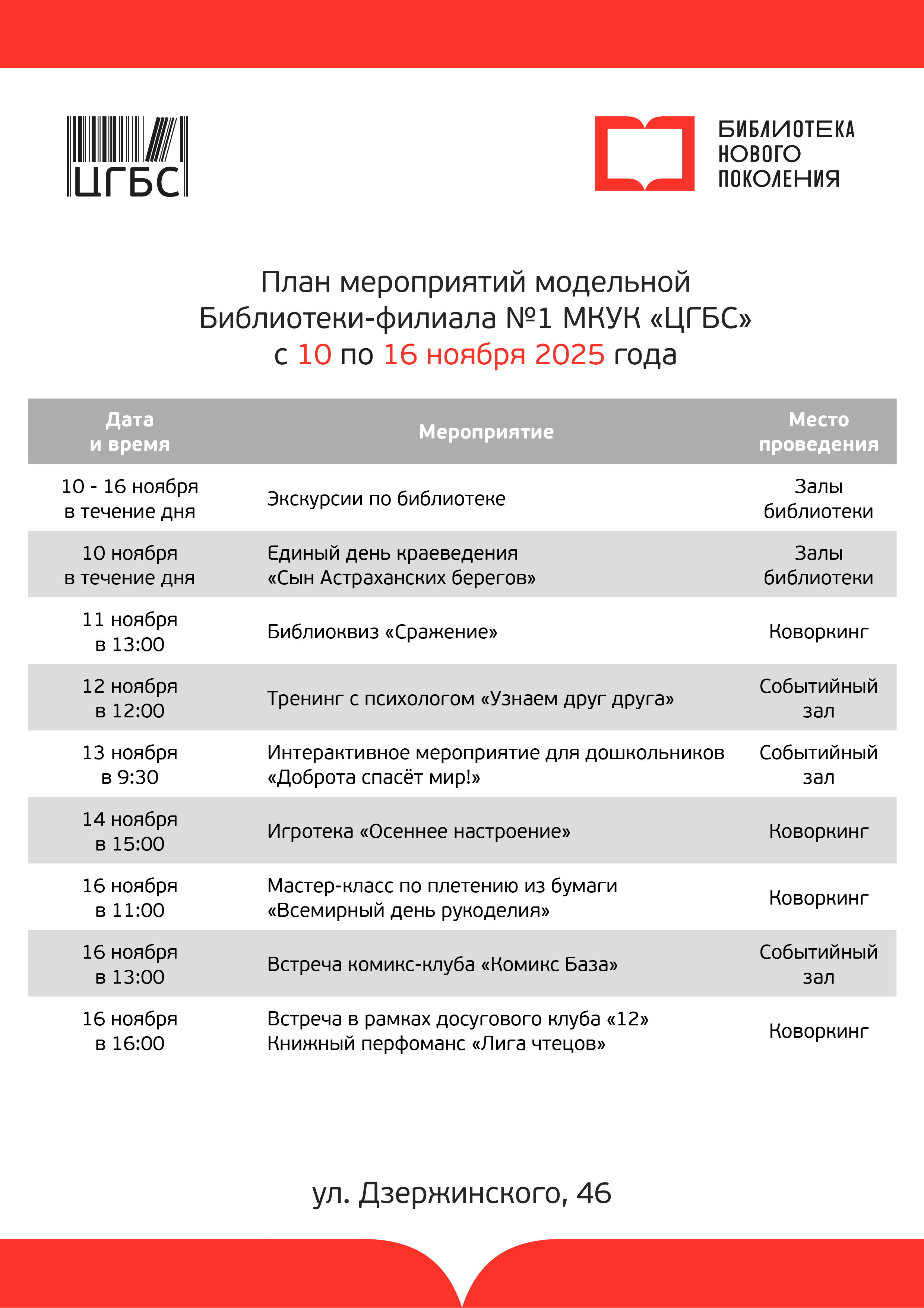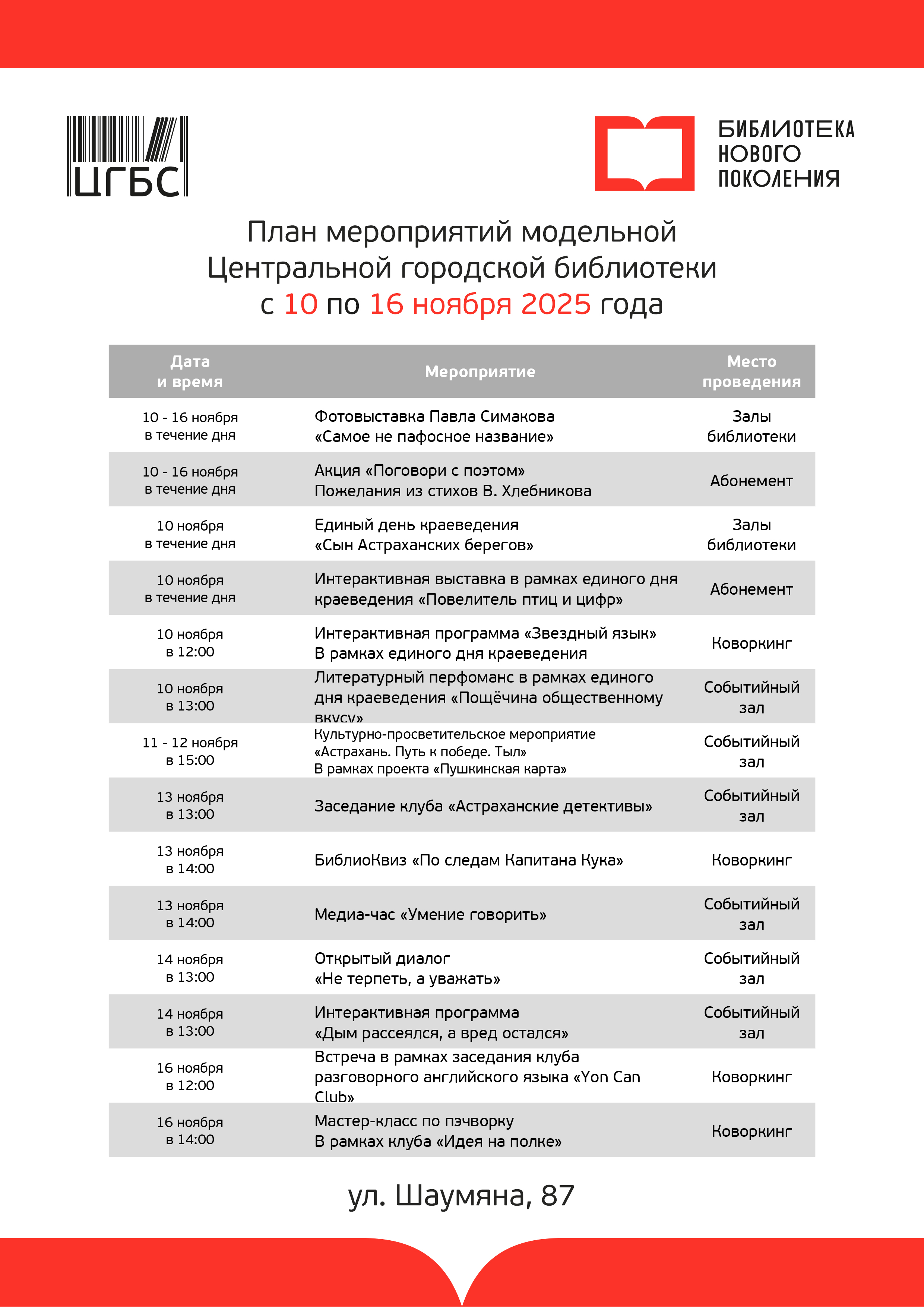 12+. В двух модельных библиотеках Астрахани, которые открыты администрацией города в рамках национального проекта «Культура», 10 ноября состоится единый день краеведения. Основная тема мероприятия - творчество астраханского футуриста Велимира Хлебникова. В библиотеке по улице Шаумяна, 87 на протяжении дня будет проходить акция «Поговори с поэтом». В 12:00 состоится интерактивная программа «Звездный язык», через час начнется перфоманс «Пощечина общественному вкусу». Интересно провести время можно будет и в библиотеке по улице Дзержинского, 46. В 13:00 все желающие примут участие в игре «Библиографические лабиринты». Часом позже состоится тематический перфоманс, а в 16:00 начнет свою работу коллажная мастерская. Но это только часть мероприятий, которые пройдут в библиотеке на следующей неделе. Всех желающих ждут заседание клуба «Астраханские детективы», медиа-час, мастер-классы, открытые диалоги, различные акции, тренинги с психологом и многое другое. Подробнее об этом в галерее ниже: