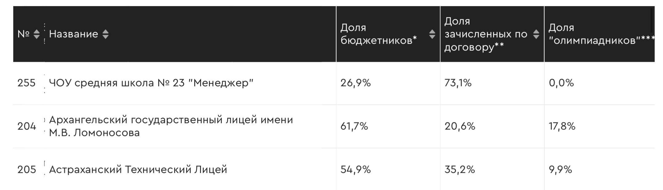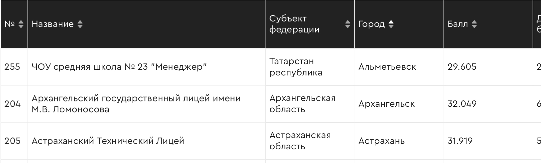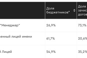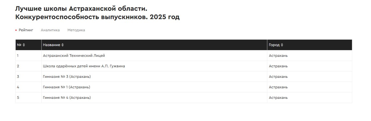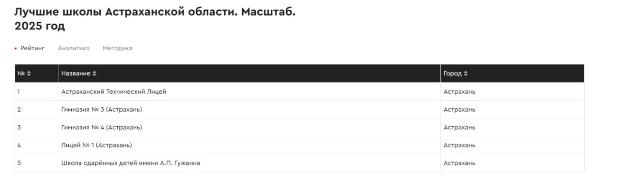 Рейтинговое агентство RAEX в одиннадцатый раз выпустило рейтинги ведущих школ России на основании данных о поступлении школьников в лучшие вузы страны. Одно среднее образовательное учреждение Астрахани также вошло в новый топ. Составлены списки двух типов. Первый - рейтинги по конкурентоспособности выпускников. В них перечислены школы с наибольшей долей выпускников, которые поступили в топовые университеты страны. Астраханский технический лицей вошел в данный топ. Оказалось образовательное учреждение на 205-м месте. Доля бюджетников составила 54,9%, доля зачисленных по договору - 35,2%, а вот доля олимпиадников крайне мала - всего 9,9%. Второй тип - списки по общему количеству выпускников, поступивших в лучшие вузы - это рейтинги в абсолютном выражении. Нет никаких поправок на численность выпускников, которые бы отражали масштабы подготовки сильных абитуриентов. В нашем регионе образовательные учреждения по конкурентоспособности выпускников расположились в топе следующим образом: А вообще лучшие школы по версии агентства в Астраханской области расположились в следующем в следующем порядке: