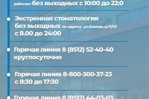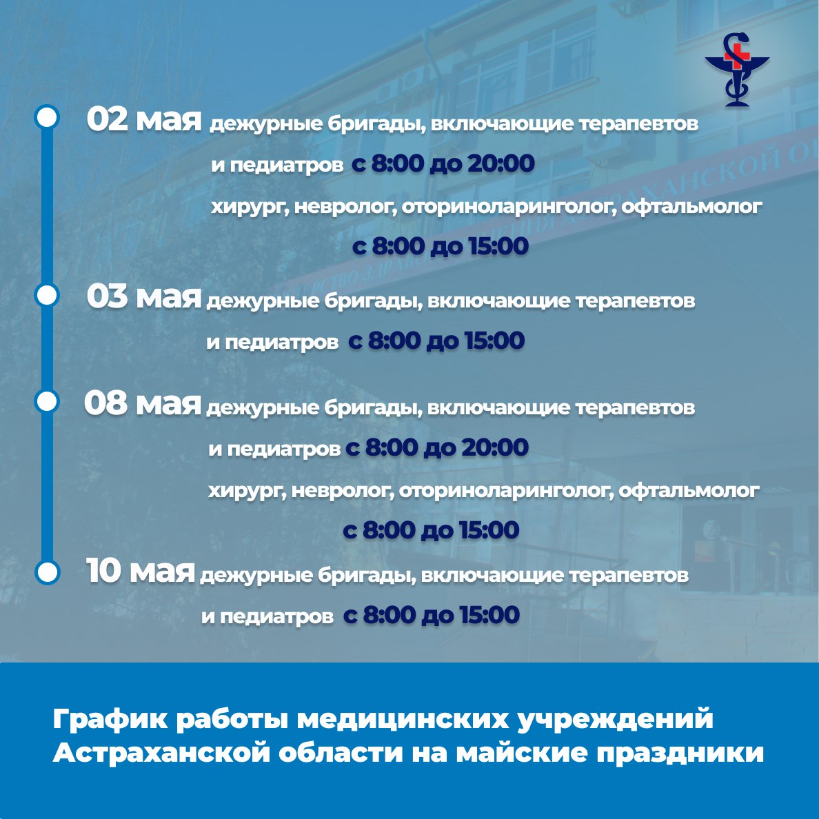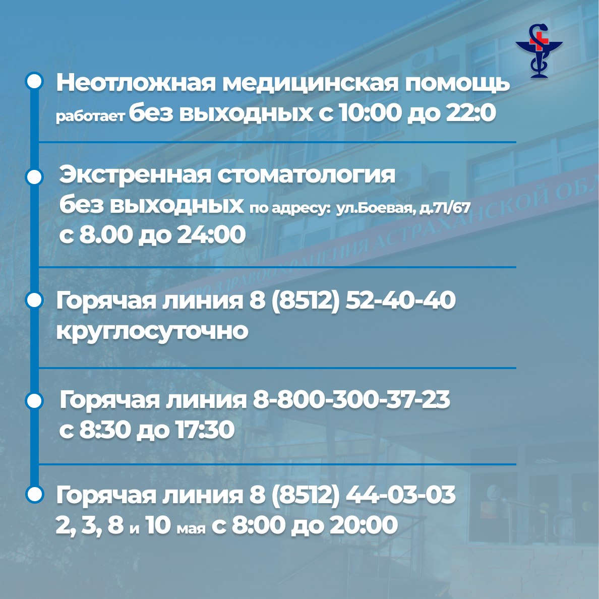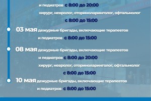 Эта рабочая неделя снова будет трехдневной - впереди новая порция выходных. График работы медицинских учреждений региона на майские праздники представило министерство здравоохранения. Во взрослых и детских поликлиниках дежурные бригады, включающие участковых врачей – терапевтов и педиатров, 8 мая будут работать с 08:00 до 20:00, а 10 мая - с 08:00 до 15:00. Бригады, в составе которых хирург, невролог, оториноларинголог и офтальмолог, будут принимать пациентов 8 мая с 08:00 до 15:00. По информации Минздрава, неотложная медицинская помощь будет функционировать без выходных с 10:00 до 22:00. Экстренная стоматология также работает ежедневно, в том числе и в праздники, по адресу: улица Боевая, д.71/67 с 08.00 до 24:00. В женских консультациях акушеры-гинекологи 8 и 10 мая примут пациенток с 08:00 до 15:00. Центр антенатальной охраны плода будет работать 8 мая с 08.00 до 15:00. Горячие линии функционируют по следующему графику: 8(800)300‐37‐23 - с 08:30 до 17:30; 8(8512)44‐0303 - 8 и 10 мая с 08:00 до 20:00; 8(8512)52‐40‐40 - круглосуточно.