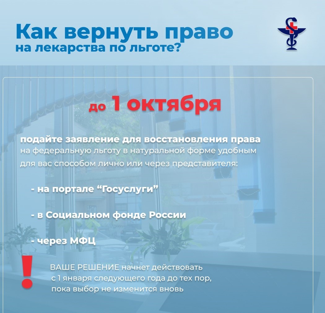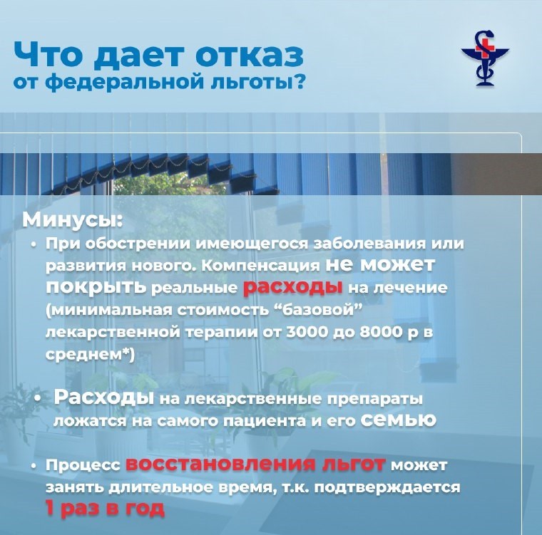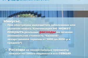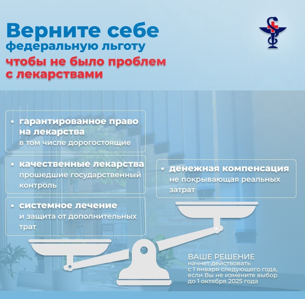 Ежегодно граждане, имеющие право на получение бесплатных лекарственных препаратов и медицинских изделий, должны сделать выбор. Льготники должны решить: пользоваться льготными лекарствами или получить минимальную денежную компенсацию. В региональном министерстве здравоохранения уточнили, что расходы на приобретение необходимых медикаментов при серьезных хронических заболеваниях могут исчисляться десятками тысяч рублей. Если гражданин выбрал денежную компенсацию, а здоровье ухудшилось, приобретать лекарства придется самостоятельно. Перед тем, как принять какое-либо решение, настоятельно рекомендуется проконсультироваться с вашим лечащим врачом. Это особенно важно для людей с хроническими заболеваниями или пожилых пациентов. Более подробно информация на данную тему представлена на карточках ниже: