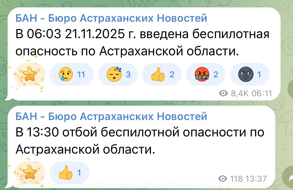 Ранее мы сообщали, что с 09:00 до 10:00 21 ноября над территорией Астраханской области средствами ПВО были ликвидированы 7 вражеских беспилотных летательных аппаратов. К их числу прибавилось еще 11. По новой информации, опубликованной Минобороны РФ, над нашим регионом были уничтожены еще 11 БПЛА. Никто не пострадал, разрушения отсутствуют. Места происшествий обследуют экстренные службы, сообщил глава региона Игорь Бабушкин. Напомним, что примерно с 07:55 в Астраханской области введен режим беспилотной опасности, а на севере, в Ахтубинском районе, режим «красный». Астраханцев просят не паниковать, не выходить из дома без лишней надобности и держаться подальше от стеклянных конструкций. При обнаружении обломков или непонятных предметов, не подходите к ним близко, сразу обращайтесь в службу 112. В 13:30 тревогу на территории Астраханской области сняли: Предыдущий раз похожая массированная атака украинскими беспилотниками на Астраханскую область произошла в ночь на 13 октября. Тогда были сбиты и уничтожены 26 БПЛА.