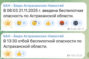 Над Астраханской областью сбили 18 беспилотников21 ноября 2025 года, 14:30