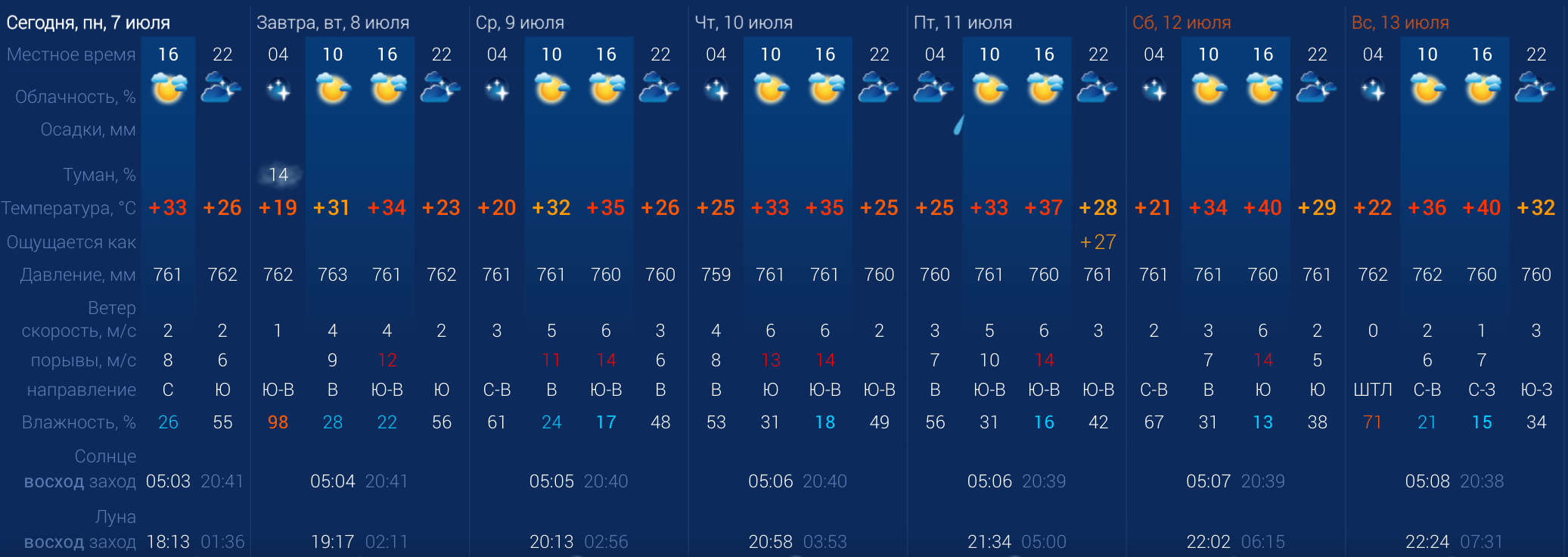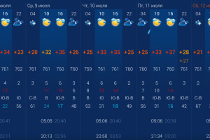 Эта неделя будет особенно жаркой после довольно прохладного июня и начала июля. Астраханцев ждет резкое повышение температуры. Так, температура днем будет колебаться от +33 до +40 градусов официально. И именно на выходных, по прогнозам синоптиков, нас ждет самое большое повышение температуры, что станет отличным поводом для поездки на речку или же в бассейн. Осадки ожидаются только в пятницу, в первой половине дня, что создаст небольшие проблемы для жителей города. В основном, погода будет облачная, так что, надеемся, жара будет ощущаться терпимее.