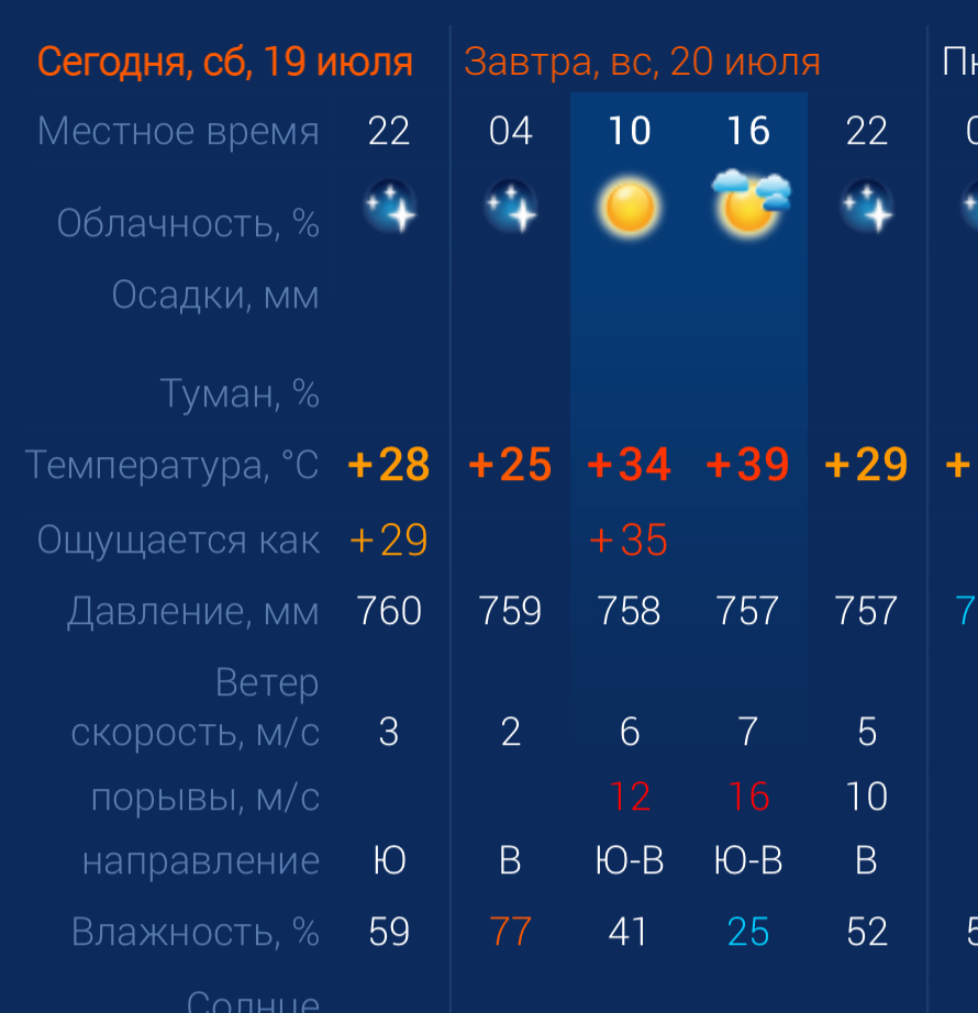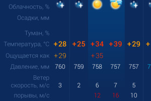 Жара в Астраханской области не собирается отступать. В воскресенье во всем регионе будет по-прежнему очень тепло. Что касается города, утром температура воздуха составит +34 градуса. Днем температура поднимется до +39. К вечеру похолодает до +29. Астраханцев ждет юго-восточный ветер со скоростью 7-16 м/с. Атмосферное давление составит 757 мм рт. ст. Влажность воздуха в пределах нормы. На территории всего региона будет восточный ветер со скоростью 5 – 10 м/с. Температура воздуха ночью опустится до +21 градуса, а днем повысится до +41. Без осадков. Погодные приметы: Наши предки считали: облака на небе растянулись полосами - к дождю. Также существует поверье: обильная роса - к ясному дню.