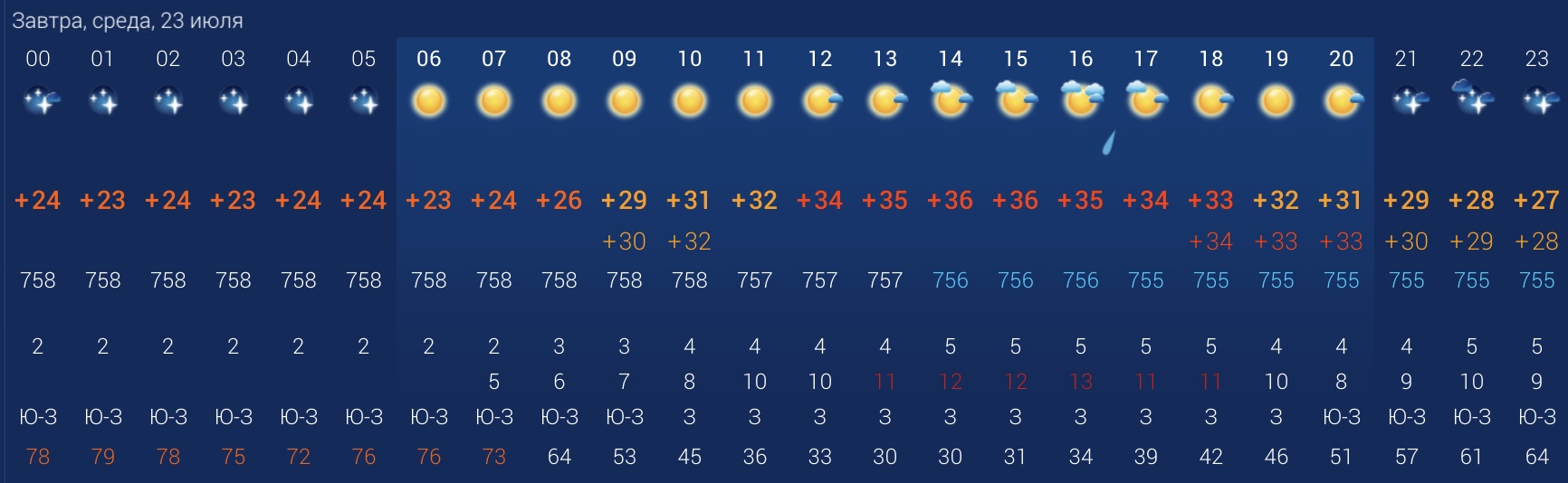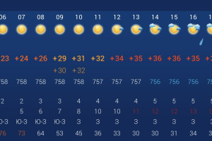 Завтра будет чуть жарче, чем сегодня. Днем температура воздуха официально будет в пределах +31…+36 градусов, а ночью понизится до +27 градусов. Во второй половине дня ожидается переменная облачность с прояснениями и небольшой дождь в 17:00. Так что советуем вам взять с собой дождевик или зонт. Влажность воздуха составит 54%. По данным погодных агрегаторов, весь день будет дуть ветер с порывами до 6 м/с. Атмосферное давление составит 757 мм рт. ст. Убывающая луна.