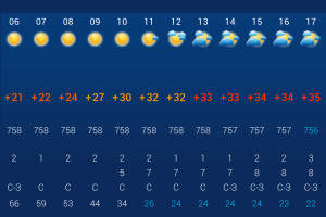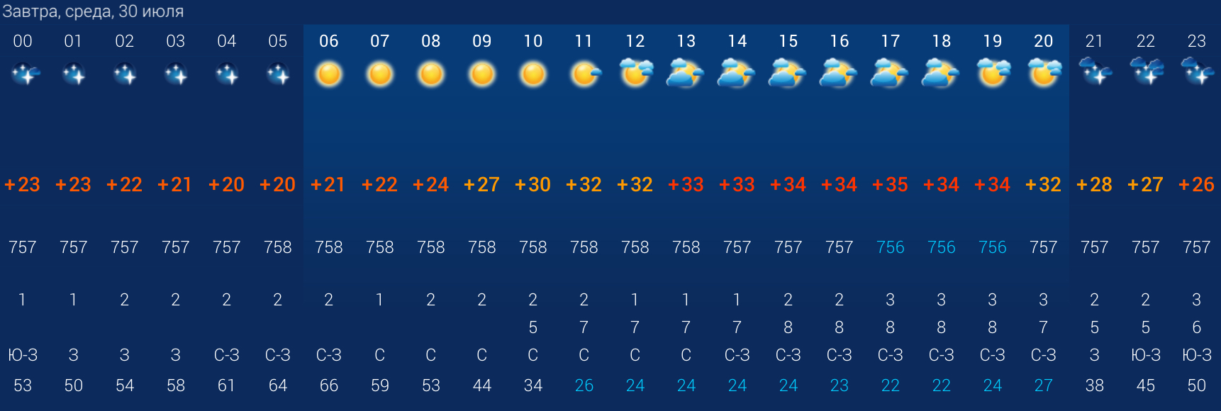 Тенденция на повышение температуры в Астрахани не заканчивается. Днем температура воздуха будет в пределах +27…+35 градусов, а ночью понизится до +26 градусов. Во второй половине дня ожидается облачность с прояснениями. Осадков не ожидается. Влажность воздуха составит 44%. По данным погодных агрегаторов, весь день будет дуть ветер с порывами до 8 м/с. Атмосферное давление составит 757 мм рт. ст. Луна растущая.