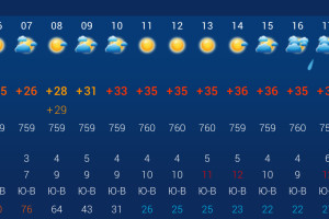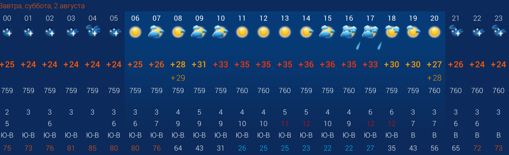 Днем температура воздуха в городе будет в пределах +31…+36 градусов, а ночью понизится до +24 градусов. В первой и во второй половине дня в областном центре будет переменная облачность. Осадки в виде дождя ожидаются с 17:00 до 18:00. Влажность воздуха составит 45%. По данным погодных агрегаторов, весь день будет дуть юго-восточный ветер с порывами до 6 м/с. Атмосферное давление составит 759 мм рт. ст. Луна растущая.