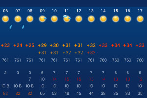 Днем температура воздуха в городе будет в пределах +29…+34 градусов, а ночью понизится до +24 градусов. Весь день в областном центре будет солнечно, но ранним утром пройдет небольшой дождь. Осадки ожидаются с 03:00 до 08:00. Влажность воздуха составит 61%. По данным погодных агрегаторов, весь день будет дуть юго-восточный ветер с порывами до 7 м/с. Атмосферное давление составит 760 мм рт. ст. Луна растущая.