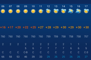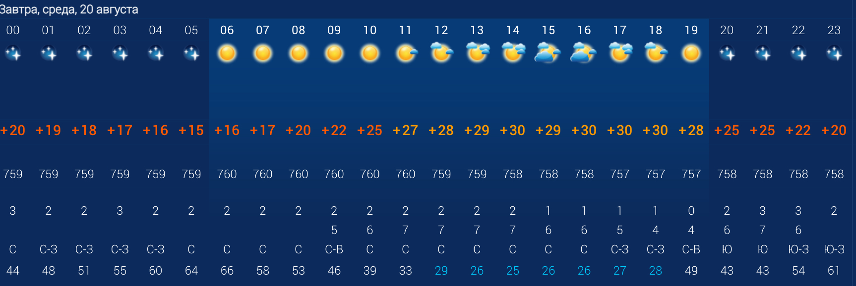 Наконец-то жара пошла на спад. Днем температура воздуха в городе будет в пределах +20…+30 градусов, а ночью понизится до +20. С 12:00 в городе будет облачно. Осадков не ожидается. Влажность воздуха составит 51%. По данным погодных агрегаторов, весь день будет дуть ветер с порывами до 3 м/с. Атмосферное давление составит 759 мм рт. ст. Луна убывающая.