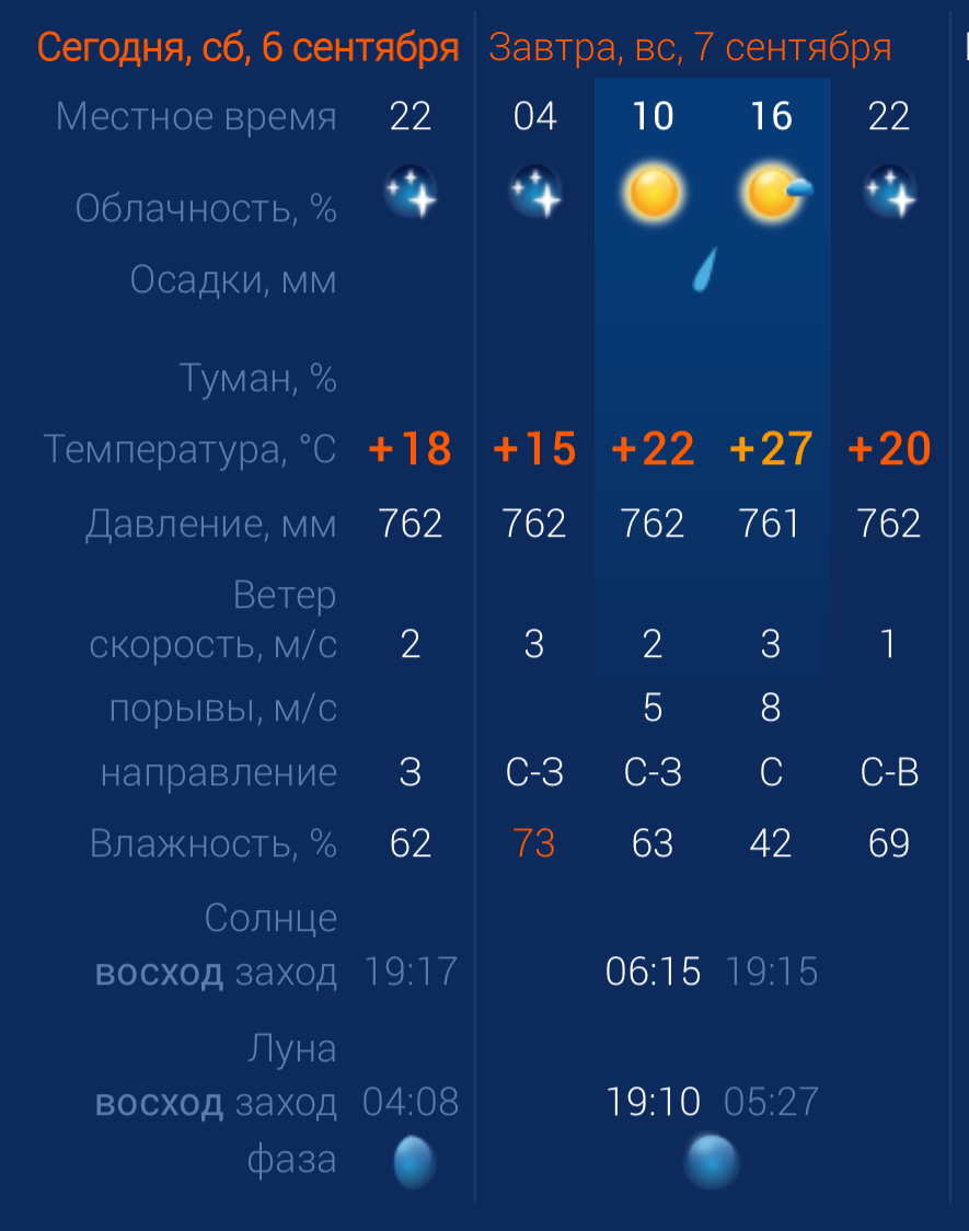 Осеннее похолодание в Астраханской области продолжается. К тому же, завтра возможны осадки в виде слабого дождя. Утром в городе температура воздуха составит +22 градуса. Днем температура повысится до +27. К вечеру похолодает до +20. На территории всего региона будет северо-западный ветер со скоростью 6 - 10 м/с. Температура воздуха ночью опустится до +10 градусов, а днем повысится до +25. Днем также возможен дождь Погодные приметы: Если в начале сентября верхушки берез пожелтели, осень наступит рано, а если береза начала желтеть снизу - бабье лето будет долгим.