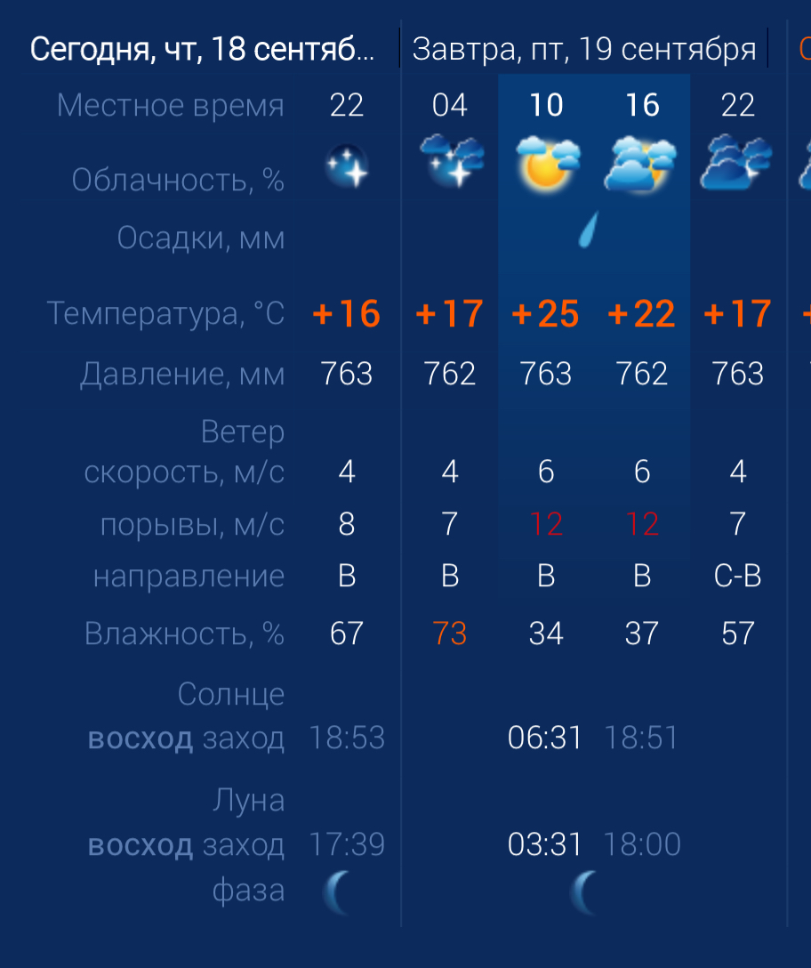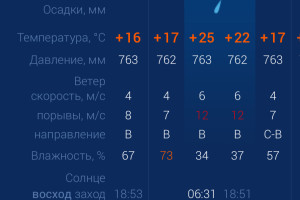 Завтра, 19 сентября, в регионе будет пасмурно и прохладно. В обед возможен слабый дождь. Утром в городе температура воздуха составит +25 градусов. Днем температура повысится до +22. К вечеру похолодает до +17. Астраханцев ждет восточный ветер со скоростью 6-12 м/с. Атмосферное давление составит 762 мм рт. ст. Влажность воздуха в пределах нормы. На территории всего региона будет восточный ветер со скоростью 5-10 м/с. Температура воздуха ночью опустится до +11 градусов, а днем повысится до +26. Днем также возможен дождь. Погодные приметы: Если в середине сентября дождливо - жди снежную зиму. А вот если целую неделю осадков не было - декабрь теплый будет.
