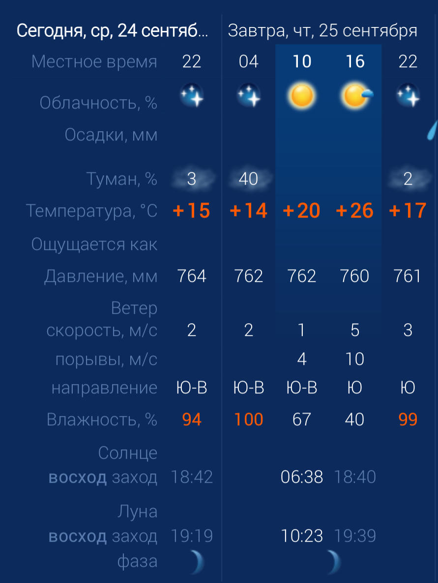 Завтра, 25 сентября, в регионе будет солнечная и достаточно приятная погода. Ночью возможен туман и небольшие осадки. Утром в городе температура воздуха составит +20 градусов. Днем температура повысится до +26. К вечеру похолодает до +17. Астраханцев ждет южный ветер со скоростью 5-10 м/с. Атмосферное давление составит 760 мм рт. ст. Влажность воздуха в пределах нормы. На территории всего региона будет южный ветер со скоростью 4-8 м/с. Температура воздуха ночью опустится до +10 градусов, а днем повысится до +26. Погодные приметы: Кошка нос прячет - жди морозов. Закат алый - к ветреной погоде.