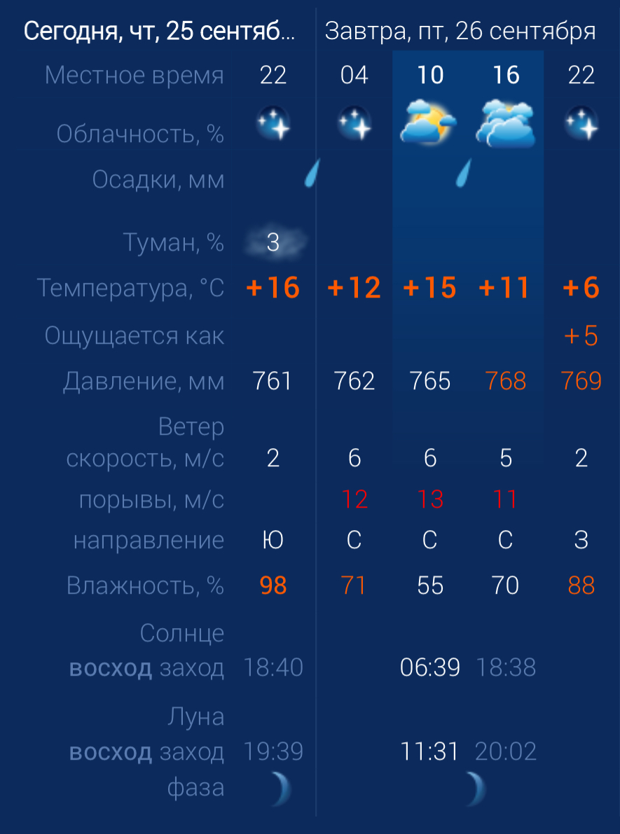 Завтра, 26 сентября, в регионе будет холодно и дождливо. Ночью возможен туман. Утром в городе температура воздуха составит +15 градусов. Днем температура упадет до +11. К вечеру похолодает до +6. Астраханцев ждет северный ветер со скоростью 5 -11 м/с. Атмосферное давление составит 768 мм рт. ст. Влажность воздуха в пределах нормы. На территории всего региона будет северный ветер со скоростью 4-12 м/с. Температура воздуха ночью опустится до +5 градусов, а днем повысится до +20. Погодные приметы: Резко похолодало в сентябре - зима снежная будет. Дожди каждую неделю в первый месяц осени - жди суровые морозы.