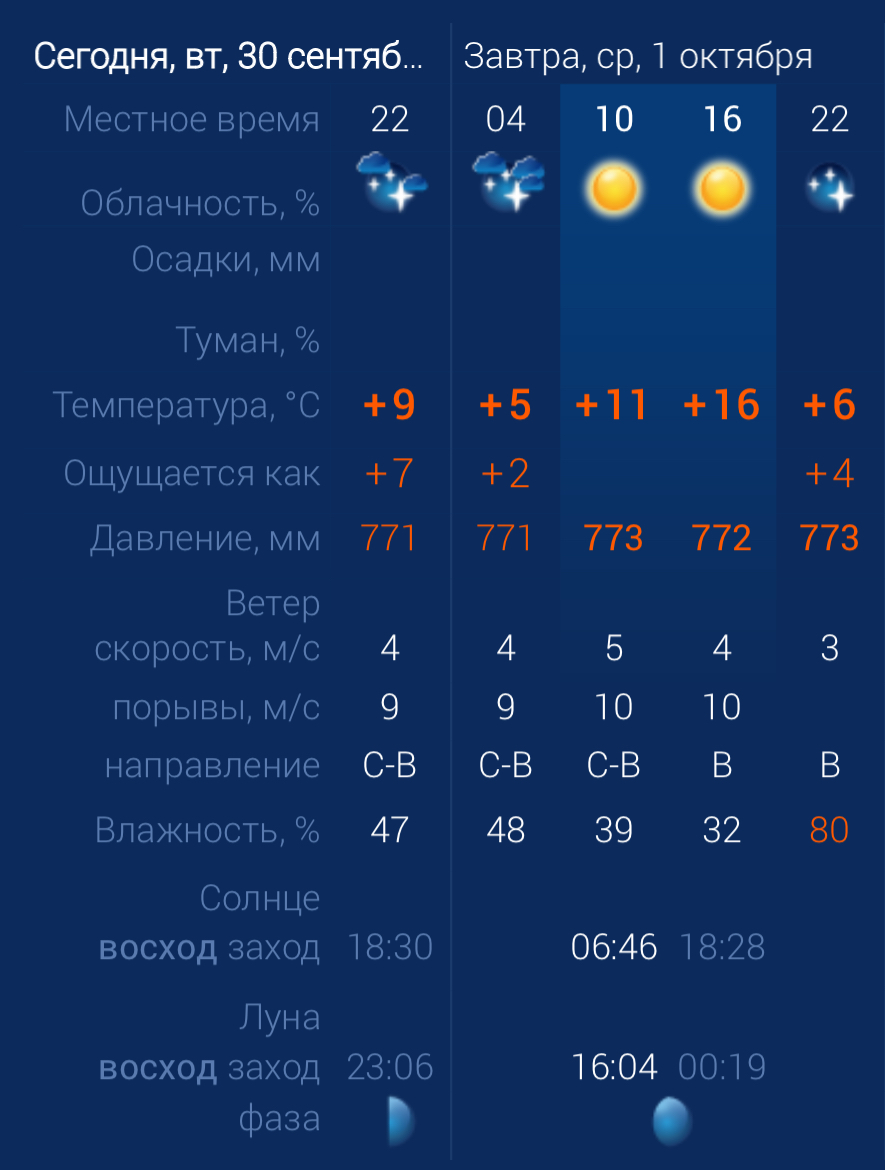 Завтра, 1 октября, в Астраханской области будет достаточно свежо, но солнечно. Без осадков. Что касается города, утром температура воздуха составит +11 градусов. Днем температура повысится до +16. К вечеру похолодает до +6. Астраханцев ждет восточный ветер со скоростью 4-10 м/с. Атмосферное давление составит 772 мм рт. ст. Влажность воздуха в пределах нормы. На территории всего региона будет восточный ветер со скоростью 5-9 м/с. Температура воздуха ночью опустится до +10 градусов, а днем повысится до +17. Погодные приметы: Ясные дни октября предвещают хорошую погоду. Если листья еще не опали, осень будет сухой и теплой. А быстро опадающие листья - к ранним холодам.