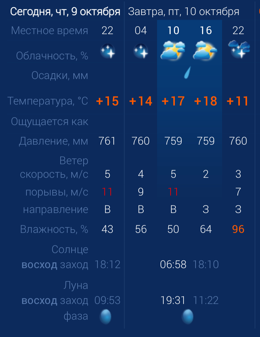 В пятницу в Астраханской области будет дождливая погода. Утром температура воздуха в городе составит +17 градусов. Днем температура повысится до +18. К вечеру похолодает до +11. Астраханцев ждет юго-восточный ветер со скоростью 5-11 м/с. Атмосферное давление составит 759 мм рт. ст. Влажность воздуха в пределах нормы. На территории всего региона будет восточный ветер со скоростью 5-12 м/с. Температура воздуха ночью опустится до +7 градусов, а днем повысится до +20. Погодные приметы: Гром 10 октября предвещает бесснежную зиму. Если пойдет ливень - зима наступит не скоро.