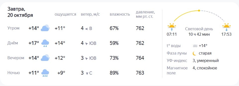 Завтра в Астраханской области будет чуть теплее, но днем и ночью ожидаются осадки. Утром столбик термометра поднимется до +14°, днем воздух прогреется до +17°, а к вечеру вернутся утренние +14°. Ночь заставит любителей прогулок под луной хорошенько утеплиться и надеть резиновые сапоги: температура воздуха упадет до +11°, а также зарядит дождь, сильнее, чем был днем. Атмосферное давление не поднимется выше 764 мм рт. ст. 20 октября православные отмечают память святых Сергия Печерского и Сергия Вологодского, в народе этот день называется Сергеем Зимним. Согласно народной примете, ясная погода на день памяти Сергея Зимнего предвещает теплые дни еще на ближайшие три недели. Однако вечерний дождь служит сигналом скорого наступления холодов в начале ноября. В этот день люди традиционно умывались кислым молоком, дарили подушки и прощали обиды. Из-за страха сглаза молчали о заработках, планах и сторонились незнакомцев. Нельзя было стричь волосы и ногти, чтобы не сократить себе жизнь. Согласно обычаю, 20 октября стоит одеть хотя бы одну новую вещь, например женщины чаще всего надевали новый платок.