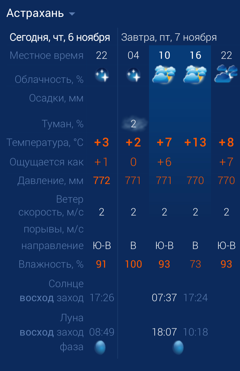 7 ноября в Астраханской области будет достаточно свежо. Ночью возможен туман. Утром температура воздуха в городе составит +7 градусов. Днем температура повысится до +13. К вечеру похолодает до +8. Астраханцев ждет восточный ветер со скоростью 2 м/с. Атмосферное давление составит 770 мм рт. ст. Влажность воздуха выше нормы. Будет пасмурно. На территории всего региона будет юго-восточный ветер со скоростью 2-6 м/с. Температура воздуха ночью опустится до +1 градуса, а днем повысится до +14. Погодные приметы: Ночной туман предвещает холодный день. Кошка нос прячет - к морозам.