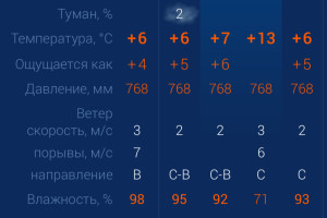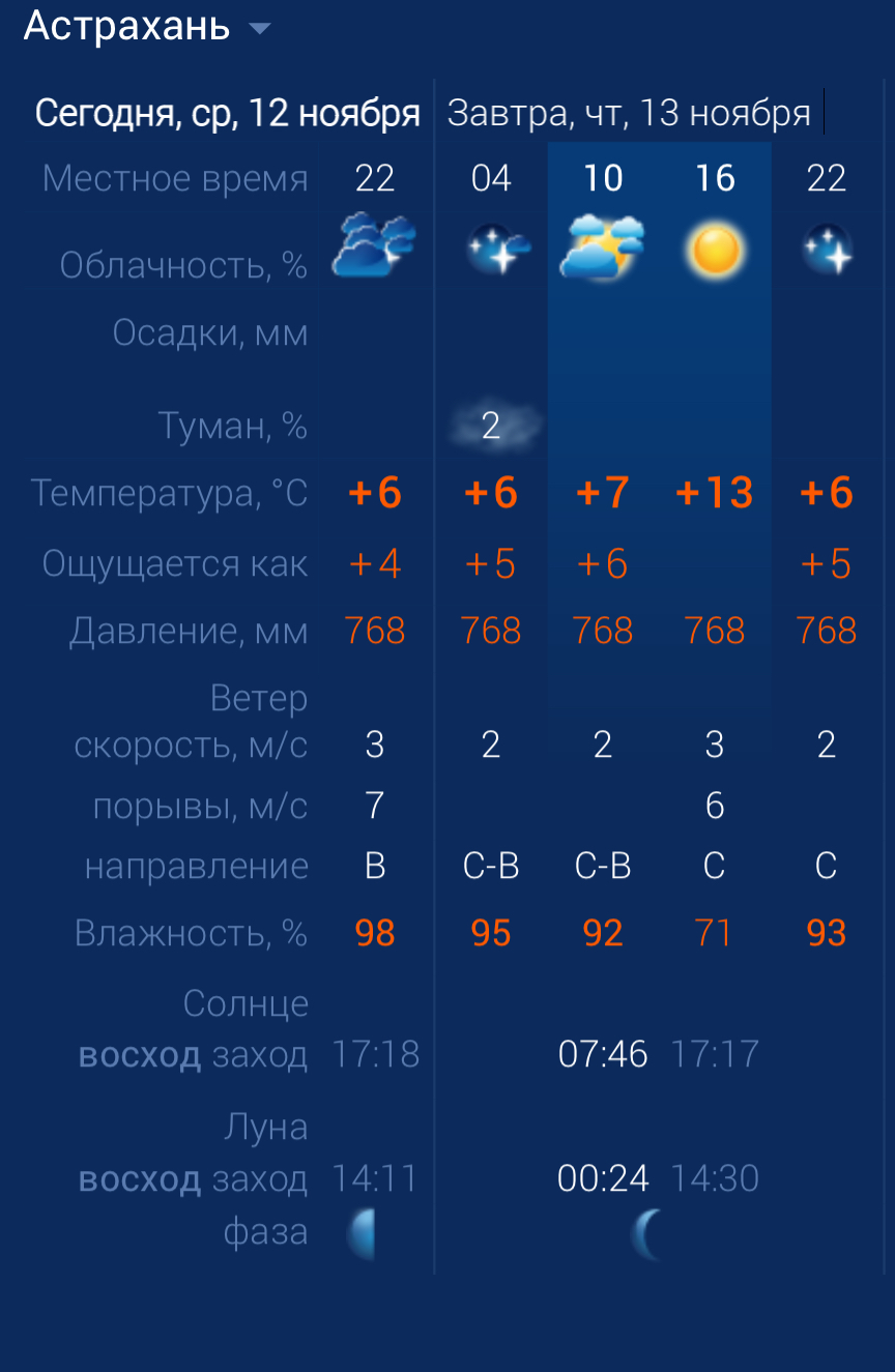 В четверг в Астраханской области будет приятная погода. Вновь возможен туман. Утром температура воздуха в городе составит +7 градусов. Днем температура повысится до +13. К вечеру похолодает до +6. Астраханцев ждет северный ветер со скоростью 3 - 6 м/с. Атмосферное давление составит 768 мм рт. ст. Влажность воздуха выше нормы. На территории всего региона будет северный ветер со скоростью 2 -6 м/с. Температура воздуха ночью опустится до +6 градусов, а днем повысится до +13. Погодные приметы: 13 ноября наблюдали за закатом: если солнце садилось в густую фиолетовую тучу на востоке - ждали осадков. А если закат не имеет розового, красного или пурпурного оттенка, к потеплению.