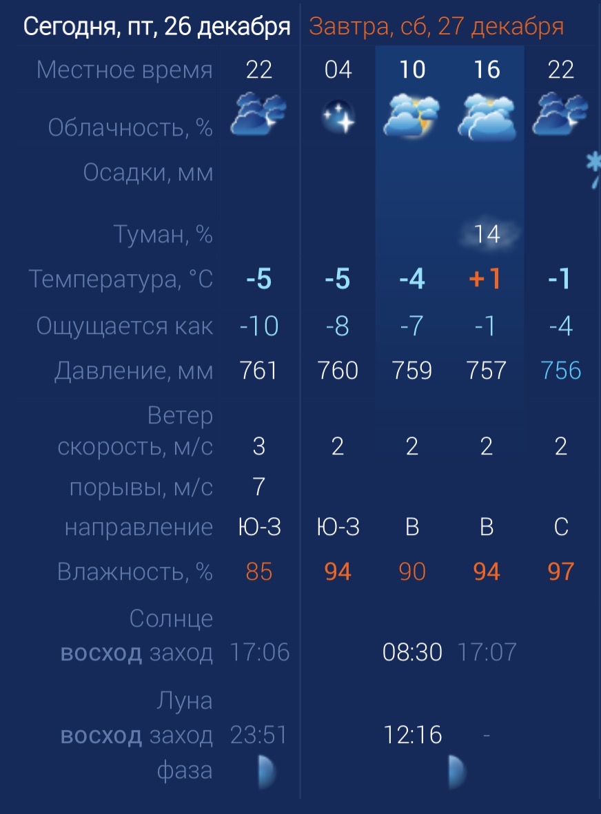В субботу в регион придет потепление. Весь снег растает и превратится в грязь. Что пожелать астраханцам в такую погоду? Наверное, только терпения. Утром температура воздуха в городе составит -4 градуса. Днем температура поднимется до +1. К вечеру похолодает до -1 градуса. Астраханцев ждет восточный ветер со скоростью 2 м/с. Атмосферное давление составит 757 мм рт. ст. Влажность воздуха выше нормы. На территории всего региона будет восточный ветер со скоростью 2-4 м/с. Температура воздуха ночью опустится до ‑7 градусов, а днем повысится до +2. Погодные приметы: Яркое солнце: Яркое зимнее солнце означает холодную зиму. Звездное небо: Звездное ночное небо обещает ясную и солнечную погоду.