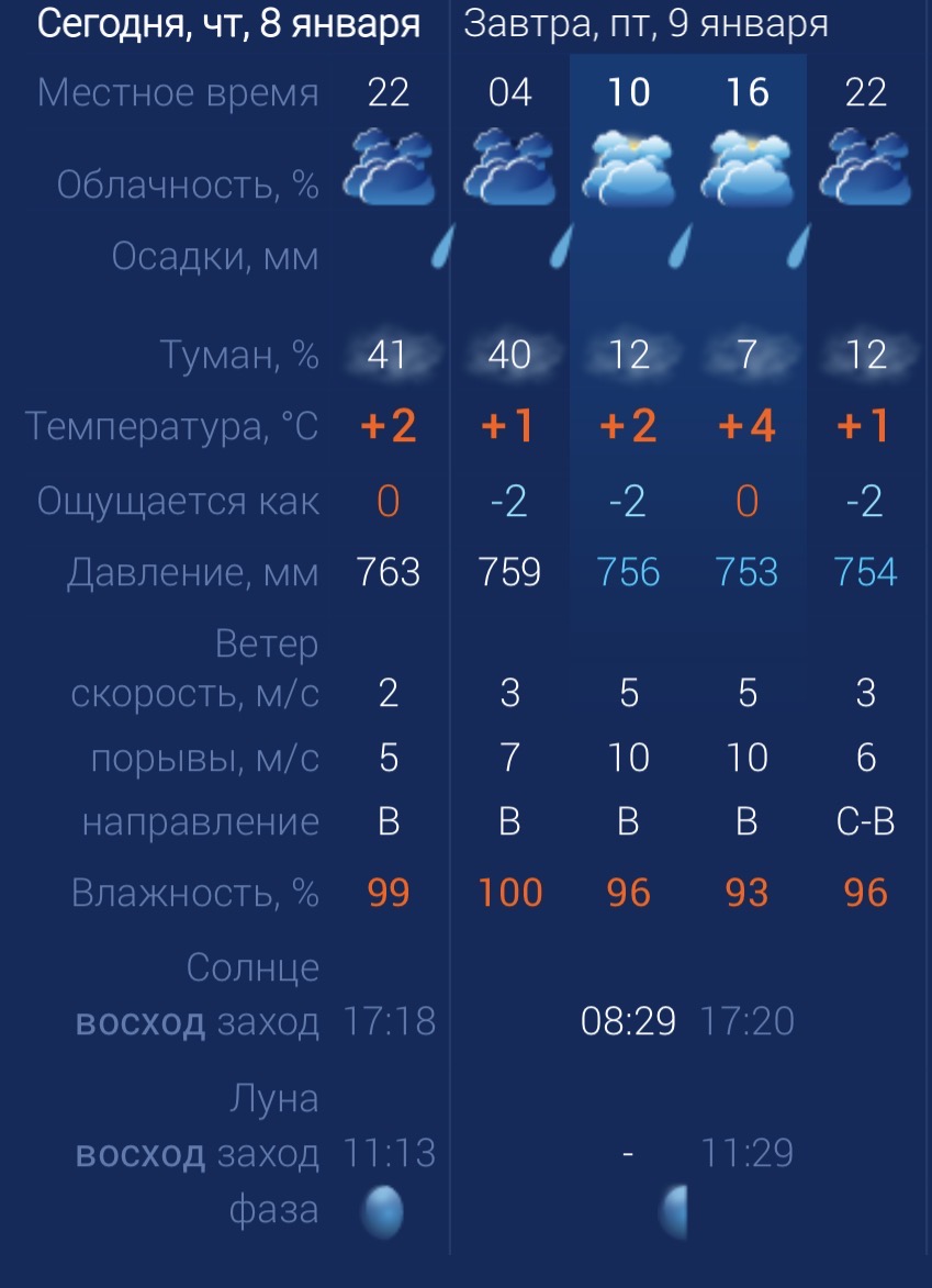 9 января в Астраханской области без погодных «сюрпризов». В регионе вновь ожидаются туман и дождь. Утром температура воздуха в городе составит +2 градуса. Днем температура поднимется до +4. К вечеру упадет до +1 градуса. Астраханцев ждет восточный ветер со скоростью 5-10 м/с. Атмосферное давление составит 753 мм рт. ст. Влажность воздуха выше нормы. На территории всего региона будет восточный ветер со скоростью 5-8 м/с. Температура воздуха ночью опустится до +2 градусов, а днем повысится до +4. Погодные приметы: Если январь выдался ясным, холодным и снежным, считается, что лето будет теплым и урожайным. Такая погода зимой благоприятствует хорошему урожаю зерновых культур летом. Частые январские оттепели предвещают дождливое и прохладное лето. Обильные снегопады в январе обещают богатый урожай грибов осенью.