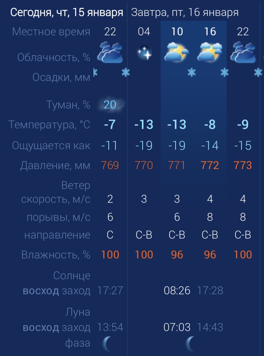 В пятницу в регионе продолжится снегопад. Правда, по прогнозам синоптиков, будет он не слишком интенсивным. Также за окном астраханцев ждут мороз и повышенная влажность. Ночью возможен туман. Утром температура в городе составит -13 градусов. Днем потеплеет до -8. К вечеру температура упадет до -9 градусов. Астраханцев ждет северо-восточный ветер со скоростью 4 -8 м/с. Атмосферное давление составит 772 мм рт. ст. Влажность воздуха выше нормы. На территории всего региона будет северо-восточный ветер со скоростью 3-9 м/с. Температура воздуха ночью опустится до ‑20 градусов, а днем повысится до ‑6. Погодные приметы: Январская метель. Если в январе часто бывают сильные метели, значит весна будет поздней и холодной. Звездное небо. Ясное звездное небо зимой предвещает морозную погоду, тогда как облачное ночное небо сулит потепление.