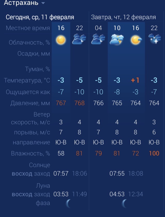 В четверг в Астраханской области будет довольно приятная погода. За окном ожидается солнце, плюсовая температура. Без осадков. Утром температура в городе составит ‑3 градуса. Днем потеплеет до +1. К вечеру температура вновь упадет до ‑3 градусов. Астраханцев ждет юго-восточный ветер со скоростью 4-8 м/с. Атмосферное давление составит 764 мм рт. ст. Влажность воздуха выше нормы. На территории всего региона будет юго-восточный ветер со скоростью 4-8 м/с. Температура воздуха ночью опустится до ‑5 градусов, а днем повысится до +1. Погодные приметы: Если в феврале нет сильных морозов, значит весна будет поздняя и холодная. Обилие снега в феврале предвещает хороший урожай летом.