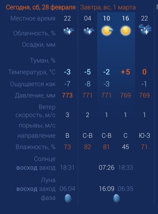 В воскресенье в регионе будет по-весеннему приятная погода. За окном ожидается переменная облачность и слабый ветер. Утром температура в городе составит ‑2 градуса. Днем потеплеет до +5. К вечеру температура упадет до 0 градусов. Астраханцев ждет северный ветер со скоростью 1 м/с. Атмосферное давление составит 769 мм рт. ст. Влажность воздуха выше нормы. На территории всего региона будет северный ветер со скоростью 1-3 м/с. Температура воздуха ночью опустится до ‑1 градуса, а днем повысится до +5. Погодные приметы: Ранняя весна: Если снег быстро стаивает в марте, значит, лето будет жарким и сухим. Позднее похолодание: Если морозы задерживаются вплоть до конца марта, то осень тоже наступит поздно, а зима будет мягкой.