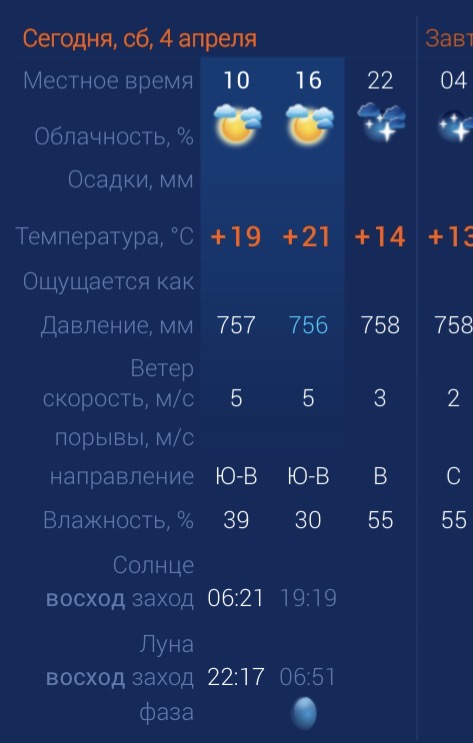 4 апреля астраханцев ждет вполне приятная погода - переменная облачность, слабый ветер и никаких осадков. Идеально для того, чтобы отдохнуть на природе или погулять по улицам города. Утром температура в Астрахани составит +19 градусов. Днем потеплеет до +21. К вечеру температура упадет до +14 градусов. Астраханцев ждет юго-восточный ветер со скоростью 5 м/с. Атмосферное давление составит 756 мм рт. ст. Влажность воздуха в пределах нормы. На территории всего региона будет восточный ветер со скоростью 3-5 м/с. Температура воздуха ночью опустится до +13 градусов, а днем повысится до +23. Погодные приметы: Прилет жаворонков - к потеплению. Вороны, сидящие на земле - к похолоданию.