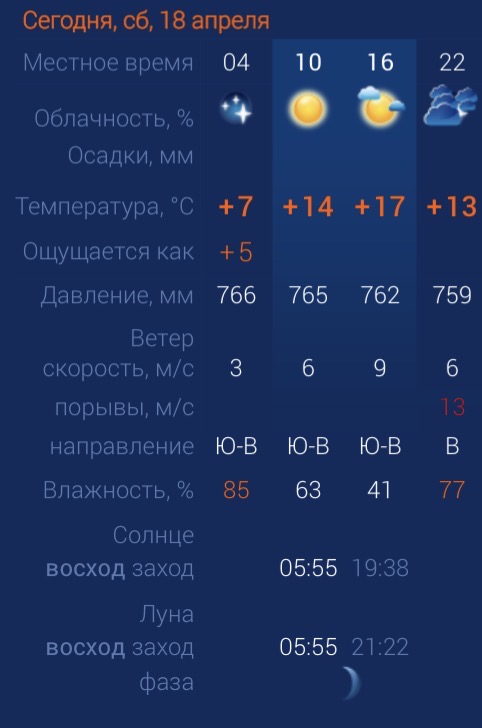 В субботу, 18 апреля, в регионе будет достаточная приятная погода: солнце и отсутствие осадков. Однако планы астраханцев все же может испортить ветер во второй половине дня. Утром температура в Астрахани составит +14 градусов. Днем потеплеет до +17. К вечеру температура упадет до +13. Астраханцев ждет юго-восточный ветер со скоростью 9 м/с. Атмосферное давление составит 762 мм рт. ст. Влажность воздуха в пределах нормы. На территории всего региона будет юго-восточный ветер со скоростью 5 ‑14 м/с. Температура воздуха ночью опустится до +10 градусов, а днем повысится до +18. Погодные приметы: Если 18 апреля дует теплый южный ветер, лето будет теплым и урожайным, а если холодный северный - весна затянется, а лето выдастся прохладным. Если в этот день идет дождь, ожидается обильный урожай зерновых и плодовых культур.