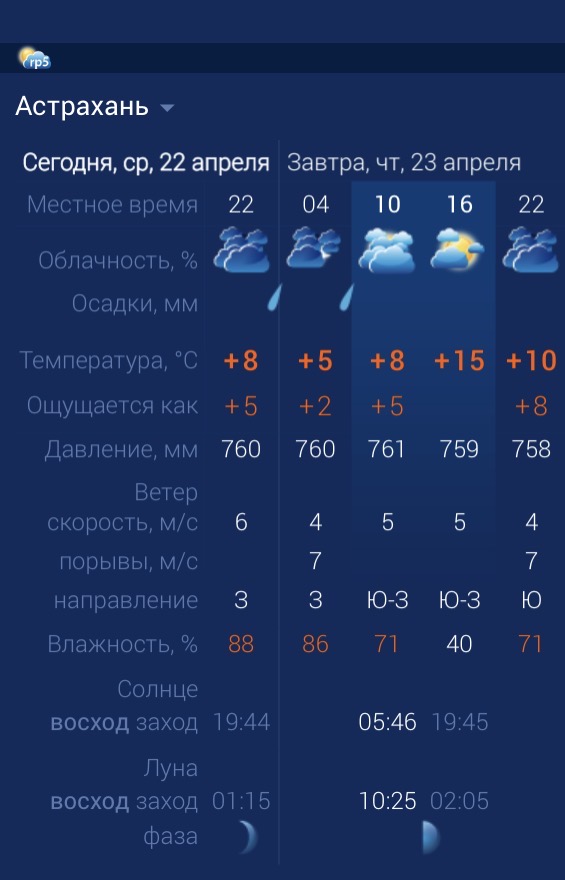 Сегодня, 23 апреля, в первой половине дня в регионе возможен дождь. К счастью, днем тучи рассеются, ожидается потепление и переменная облачность. Утром температура в Астрахани составит +8 градусов. Днем потеплеет до +15. К вечеру температура упадет до +10. Астраханцев ждет юго-западный ветер со скоростью 5 м/с. Атмосферное давление составит 759 мм рт. ст. Влажность воздуха в пределах нормы. На территории всего региона будет юго-западный ветер со скоростью 5 -8 м/с. Температура воздуха ночью опустится до +4 градуса, а днем повысится до +17. Погодные приметы: Солнце в туманной дымке 23 апреля - год будет хлебородным, зерно уродится на славу. Эта примета связана с тем, что в старину 23 апреля часто называли Терентием Маревным, и утреннее солнце нередко вставало в дымке, что считалось добрым знаком для урожая. Появление в доме маленьких пауков - к скорому и устойчивому потеплению. Если в этот день замечали молоденьких паучков, это предвещало теплую погоду и окончательный приход весны.
