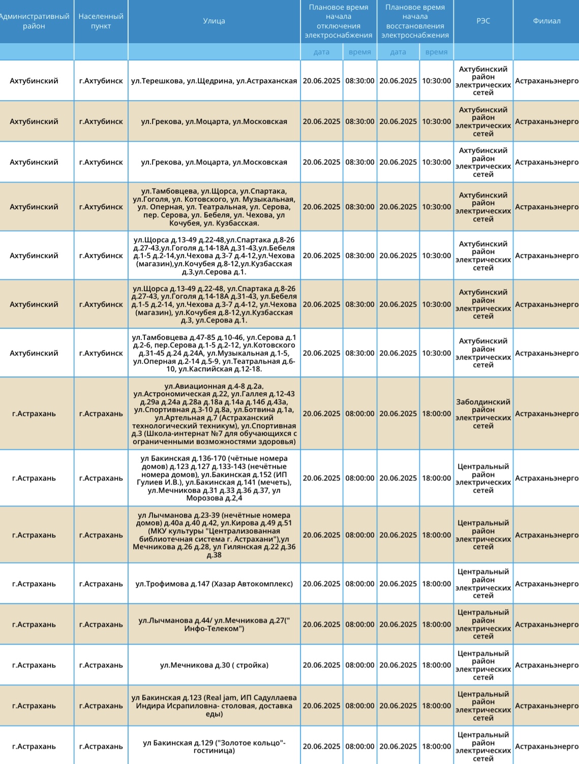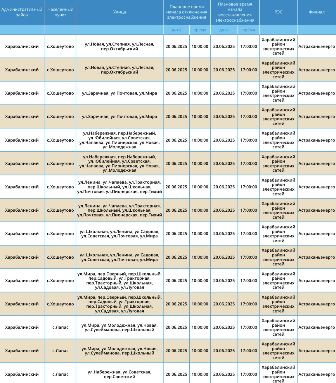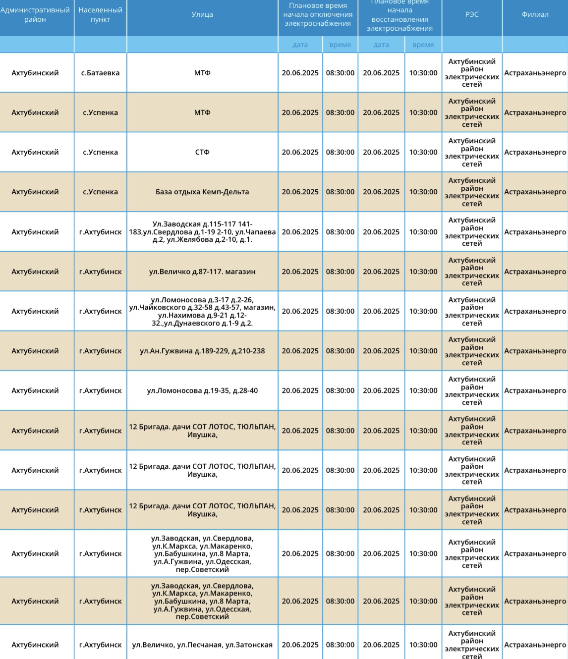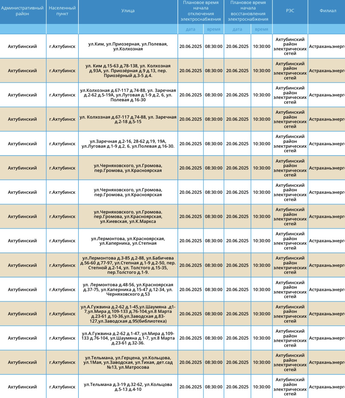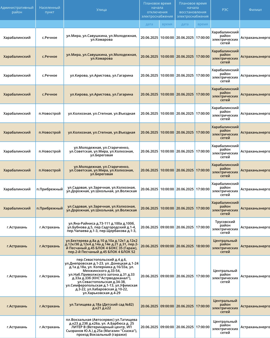 20 июня некоторые астраханские села останутся без света19 июня 2025 года, 21:10