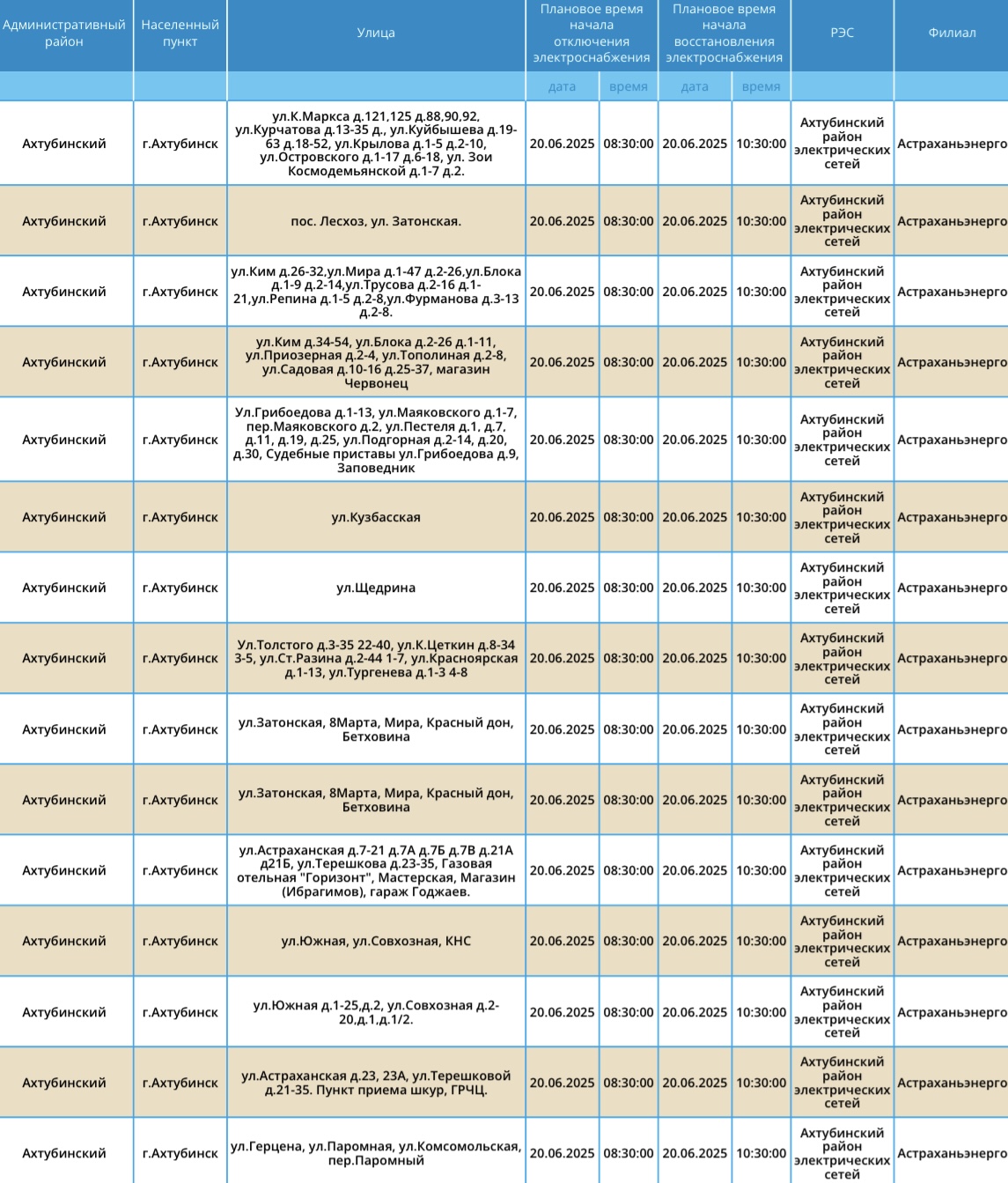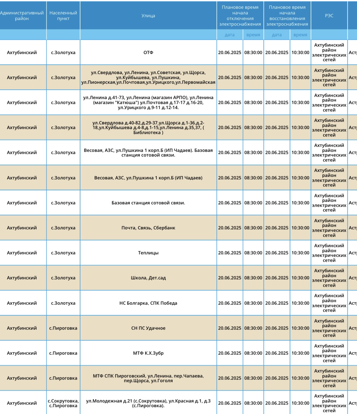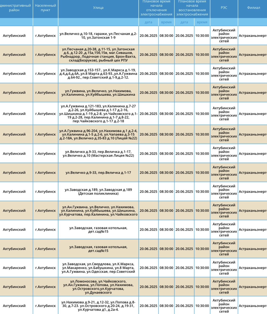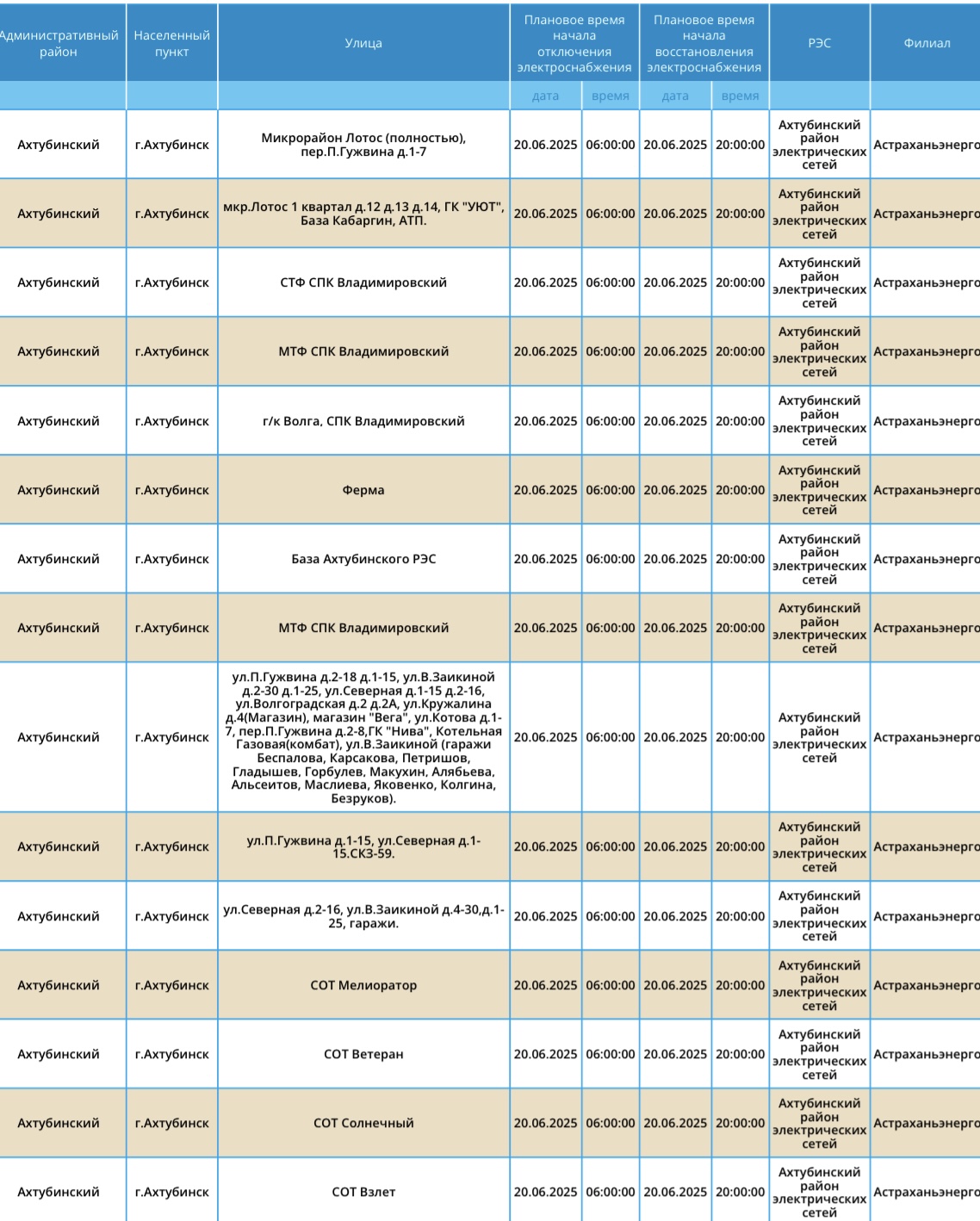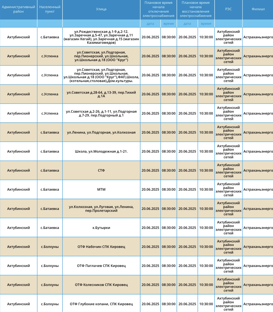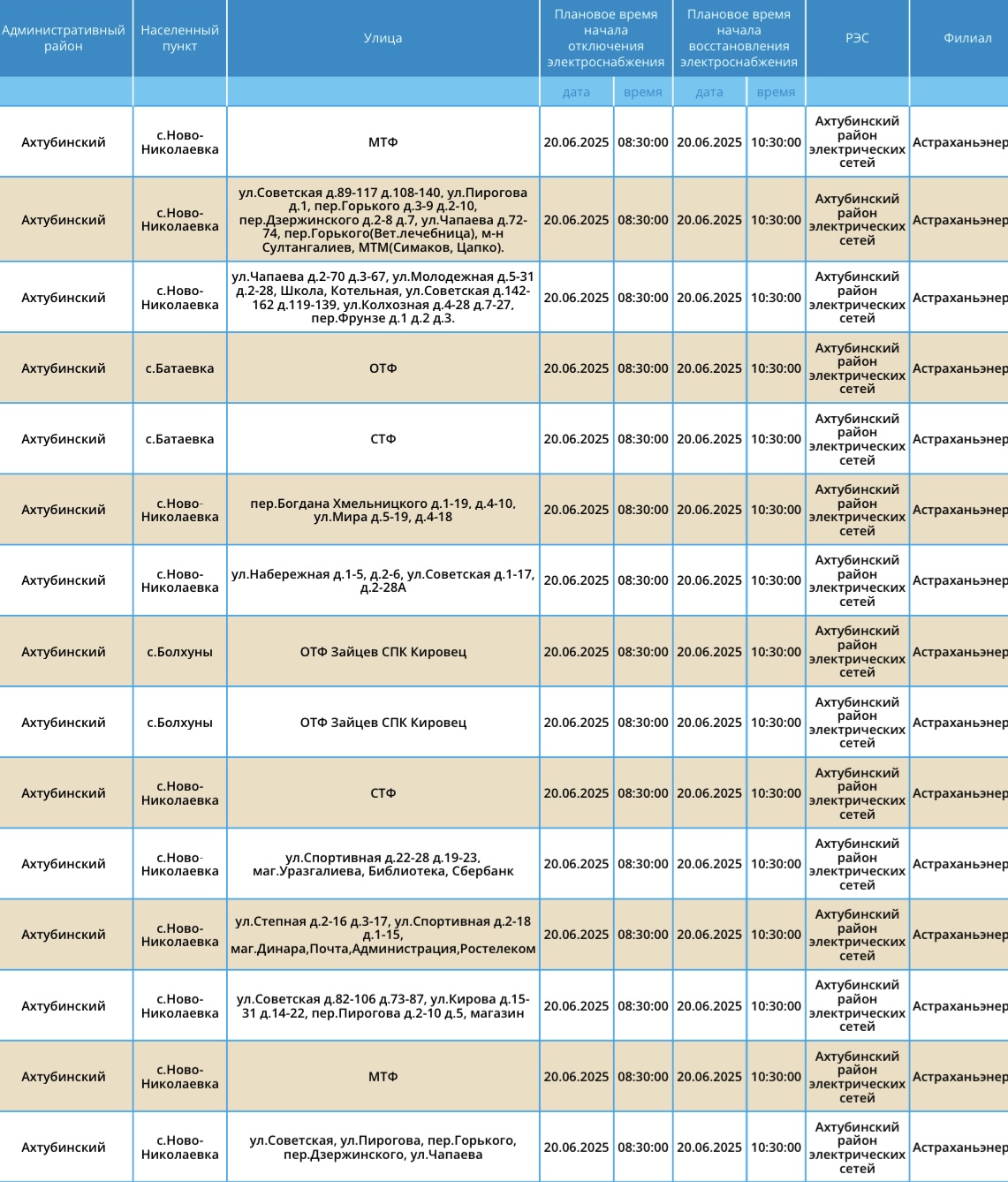 20 июня некоторые астраханские села останутся без света19 июня 2025 года, 21:10
