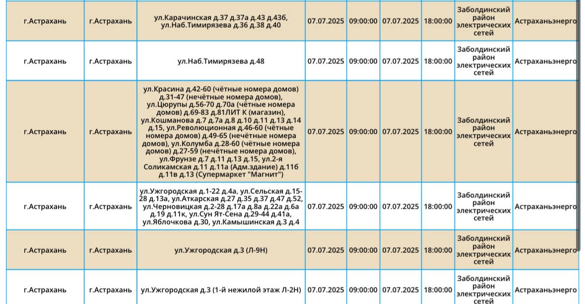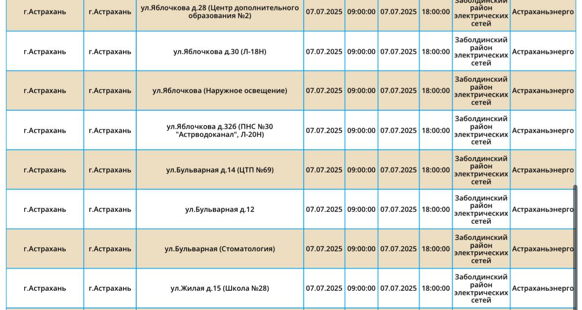 Плановые отключения, которые проведут энергетики 7 июля, затронут как жилые дома, так и административные здания. Публикуем полный список. Электроэнергии не будет, в частности, в стоматологии, банке и нескольких магазинах. На несколько часов свет отключат по некоторым адресам в Астрахани, а также в Приволжском и Ахтубинском районах. Подробный список адресов, где в понедельник временно не будет света, можно увидеть здесь. А если отключения произошли внепланово, звоните по телефонам, которые указаны ниже: