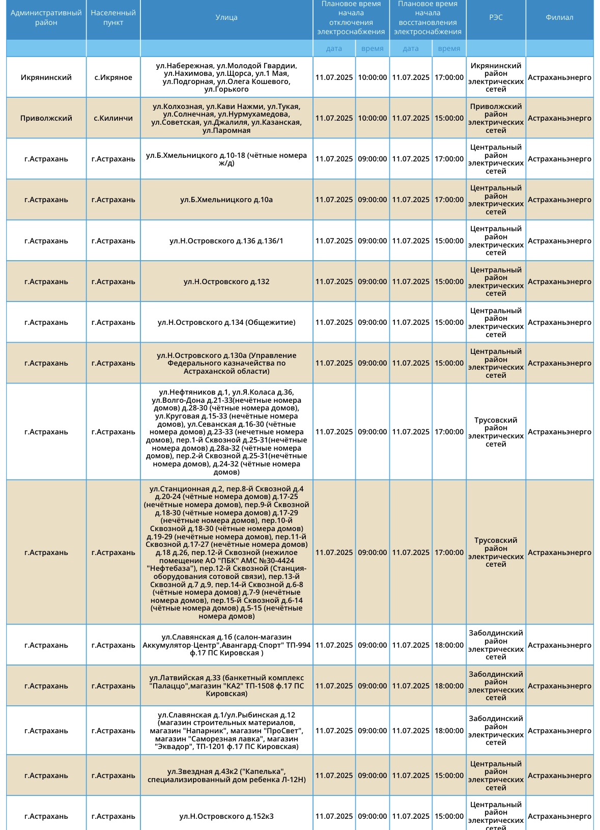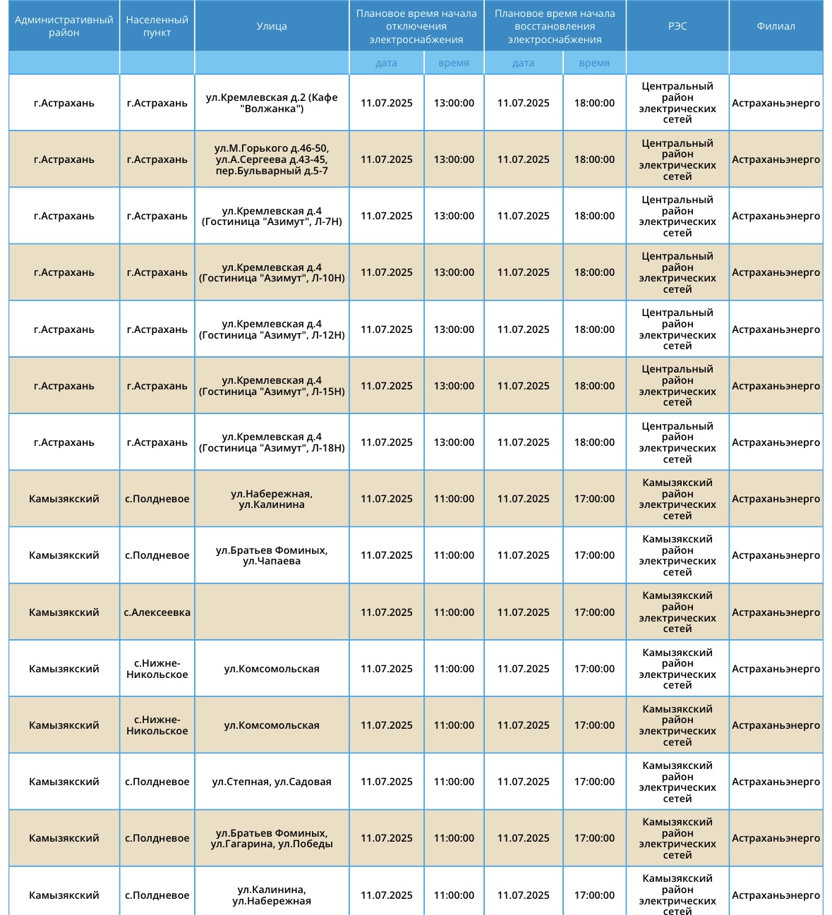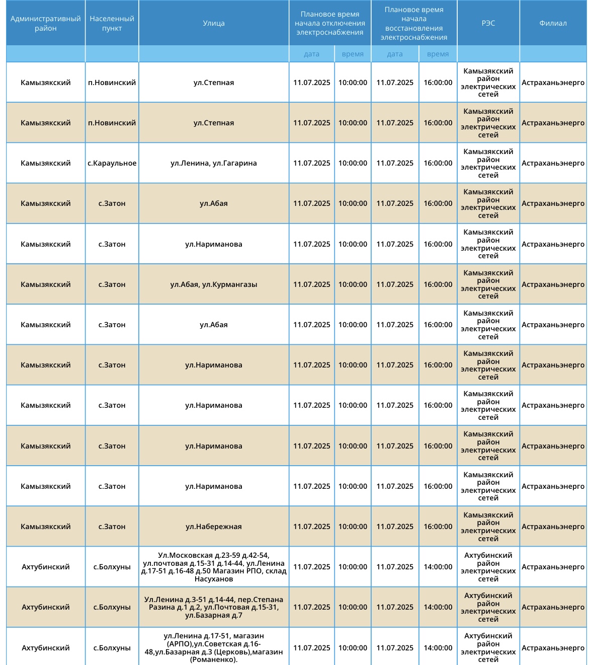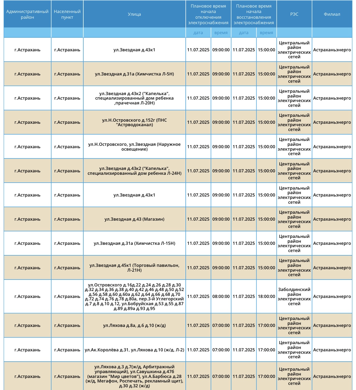 11 июля астраханцев ждут массовые отключения света10 июля 2025 года, 20:50