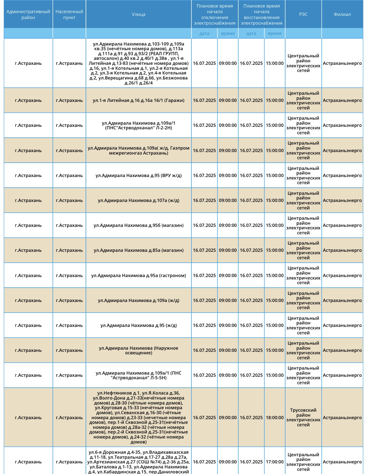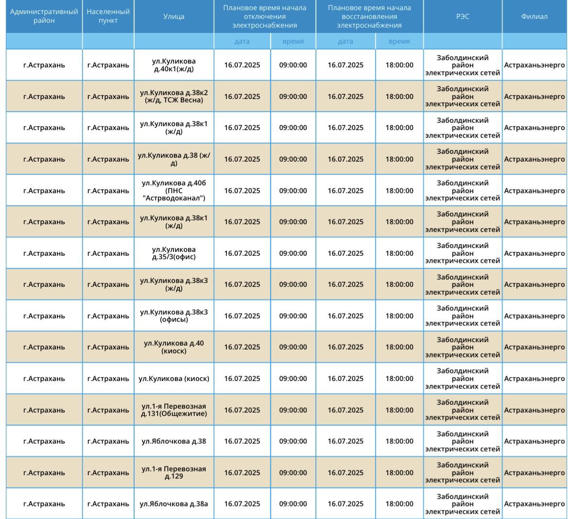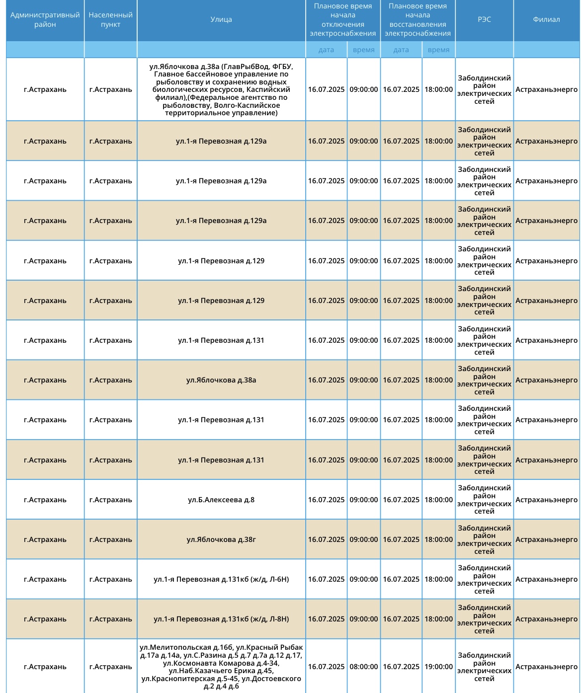 16 июля в Астрахани пройдут массовые отключения света15 июля 2025 года, 20:40