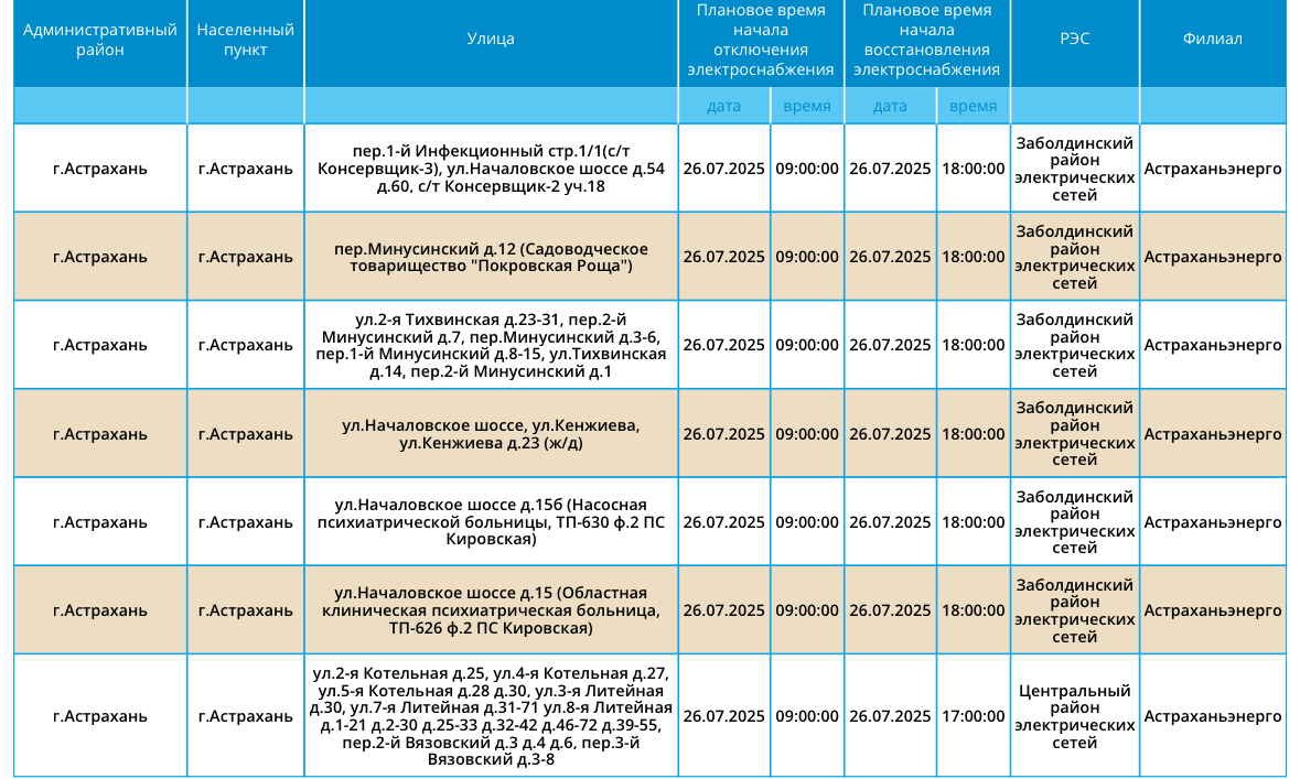 Завтра, 26 июля, в Астрахани вновь пройдут плановые отключения электроэнергии. Об этом сообщает ПАО «Россети Юг». Так, света не будет на некоторых улицах Астрахани. Без электричества останутся жилые дома и садоводческие товарищества. А информацию о всех коммунальных проблемах нашего города вы можете найти здесь. На этом сайте, в режиме реального времени, вы можете наблюдать за отключениями света, воды и т.д.