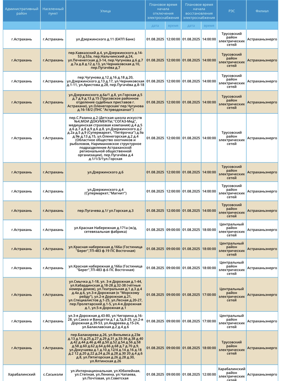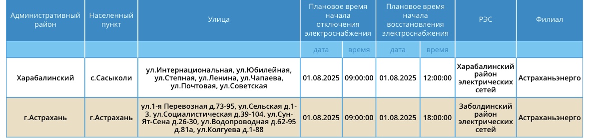 Завтра, 1 августа, на территории Астраханской области вновь пройдут плановые отключения электроэнергии. Об этом сообщили в пресс-службе ПАО «Россети Юг». Так, света не будет на некоторых улицах Астрахани, а также в Харабалинском районе области. Без электричества останутся жилые дома, магазины и гостиница. Подробности в галерее ниже: А информацию обо всех коммунальных проблемах нашего города вы можете найти здесь. На этом сайте, в режиме реального времени, вы можете наблюдать за отключениями света, воды и т.д.