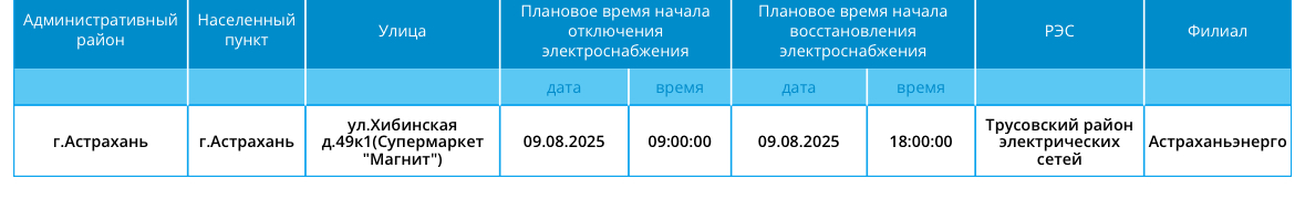 Завтра, 9 августа, на территории Астрахани вновь пройдут плановые отключения электричества. Об этом сообщили в пресс-службе ПАО «Россети Юг». Так, света не будет на улице Хибинская в Астрахани. Без электричества останется супермаркет «Магнит». Подробности ниже: А информацию обо всех коммунальных проблемах нашего города вы можете найти здесь. На этом сайте, в режиме реального времени, вы можете наблюдать за отключениями света, воды и т.д.