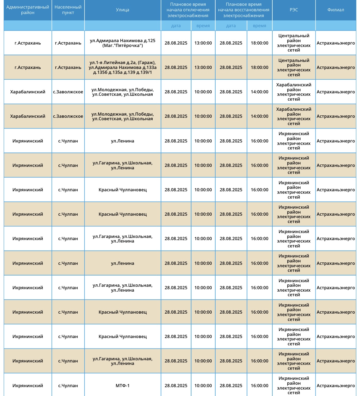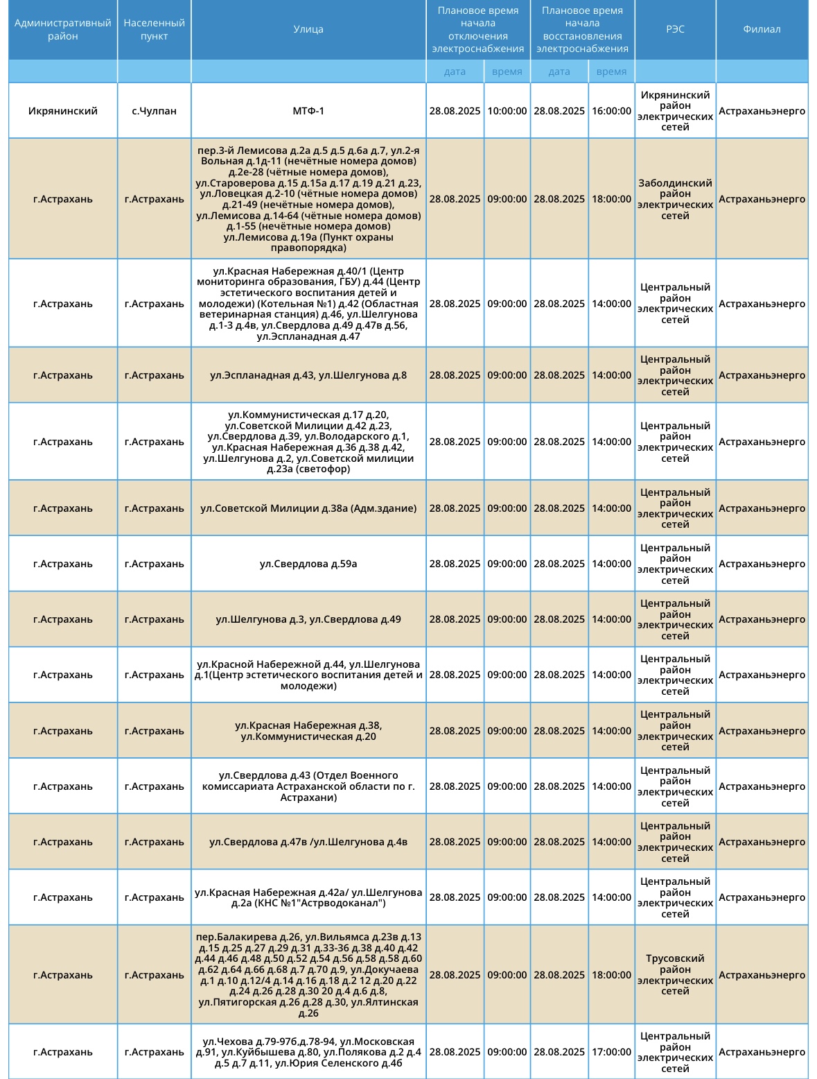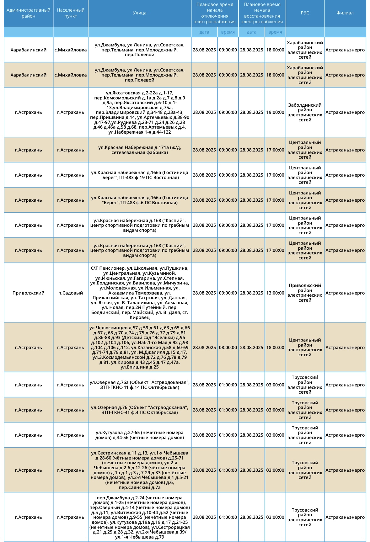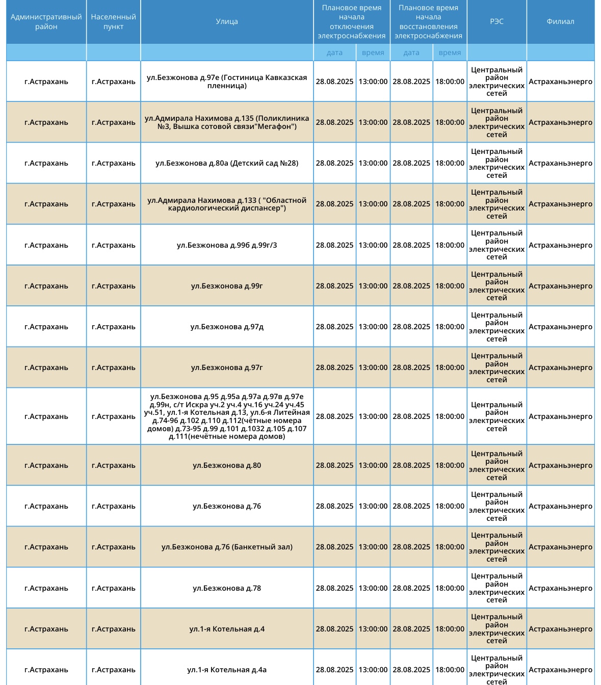 28 августа жителей Астрахани и области ждут масштабные отключения электроэнергии27 августа 2025 года, 18:40