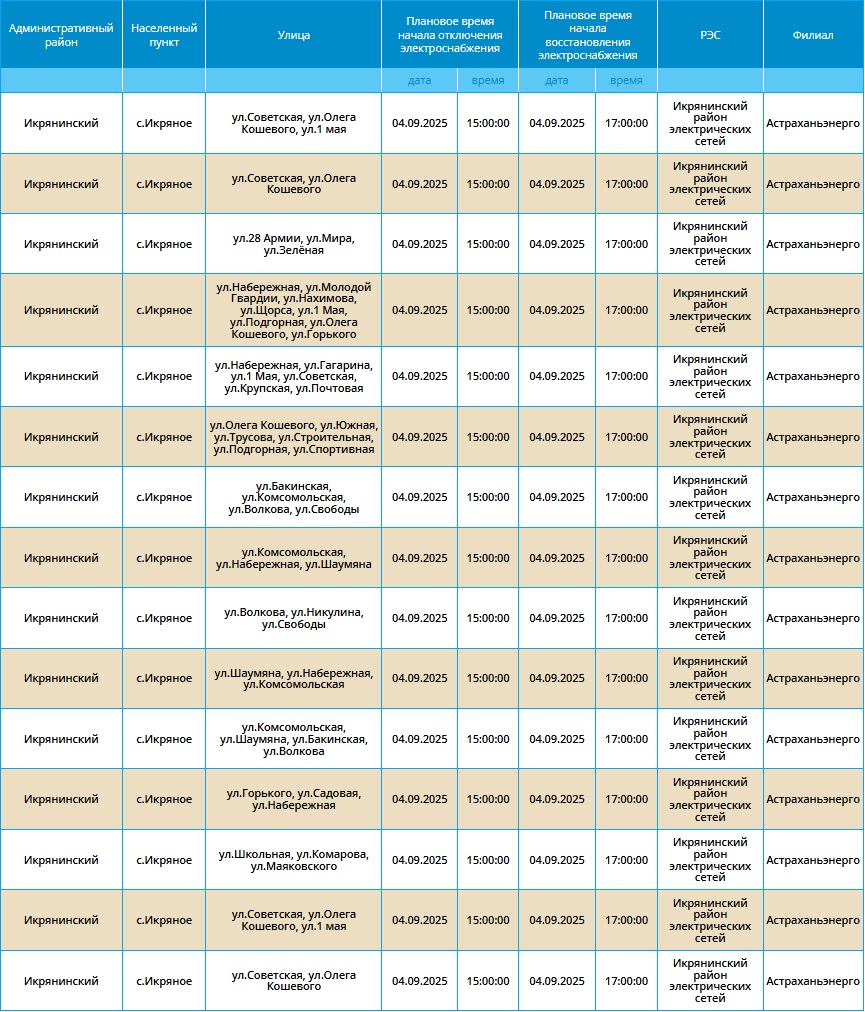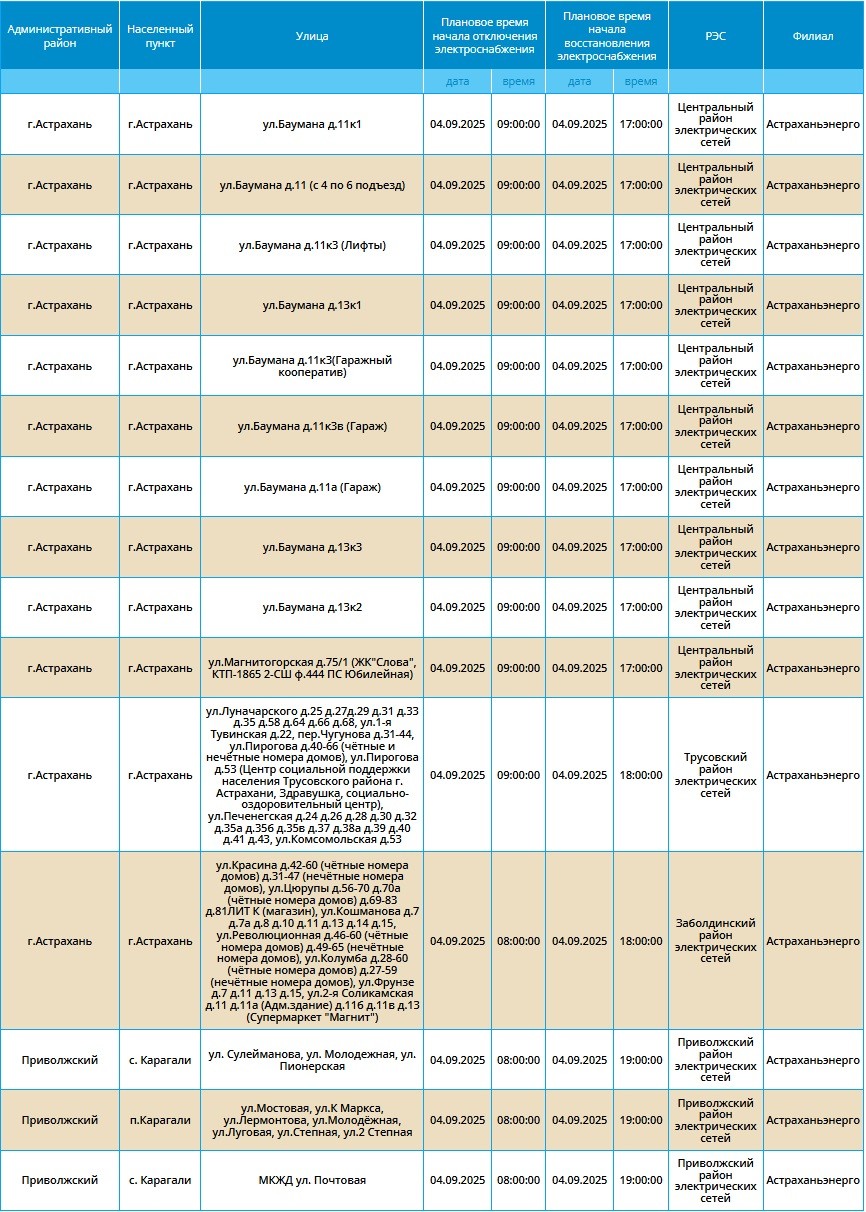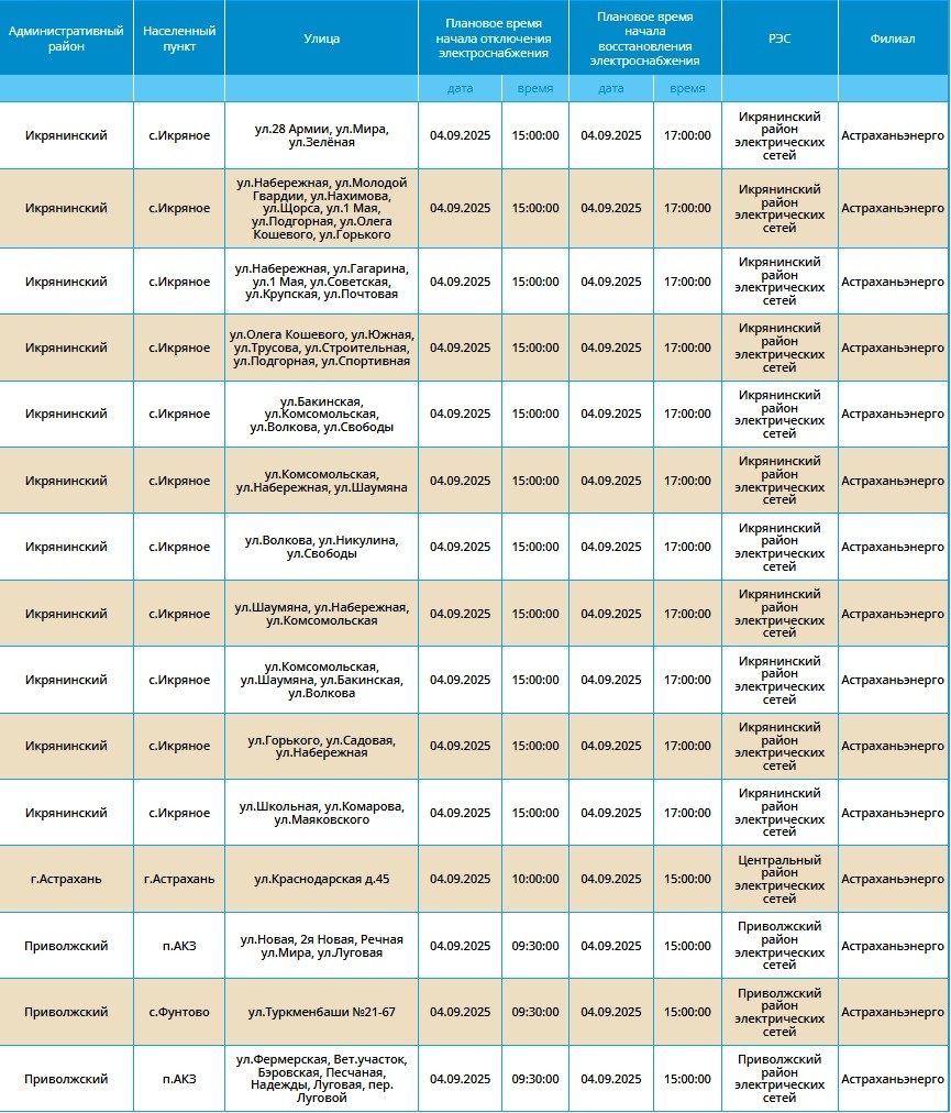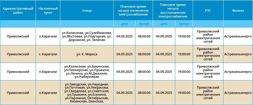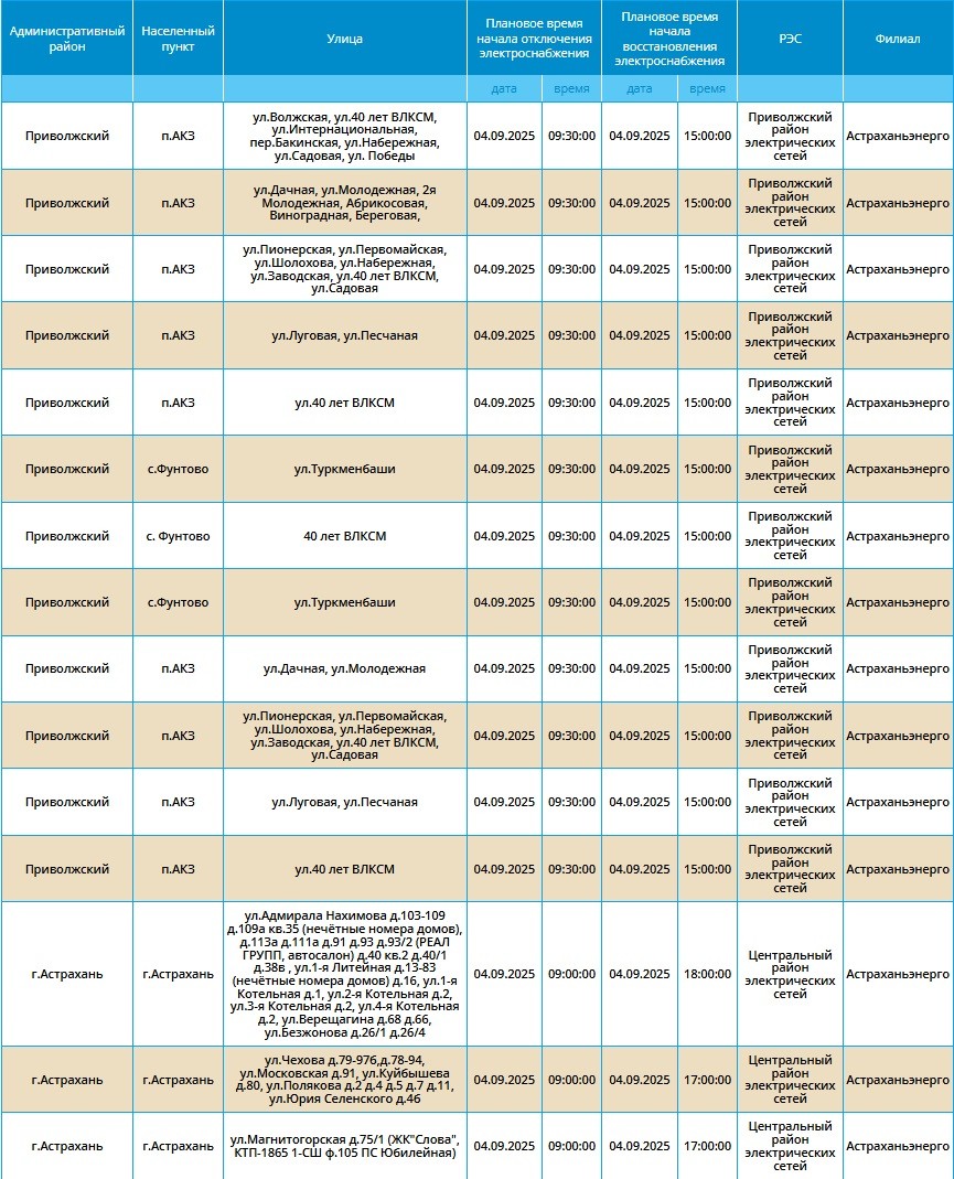 Завтра, 4 сентября, на территории Астраханской области вновь пройдут плановые отключения электричества. Об этом сообщили представители ПАО «Россети Юг». Так, света не будет как в самом городе Астрахань, так и в Икрянинском и Приволжском районах. Без электричества останутся сотни жилых домов. Подробнее со списком отключений можно ознакомиться в галерее ниже: Более оперативно получать информацию о коммунальных проблемах нашего города вы можете здесь. На сайте по активной ссылке в режиме реального времени можно наблюдать за отключениями света, воды и т.п.