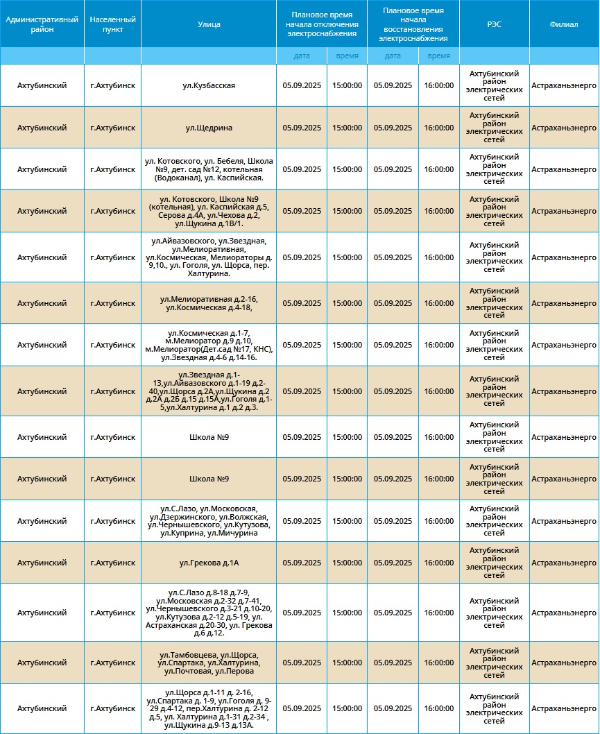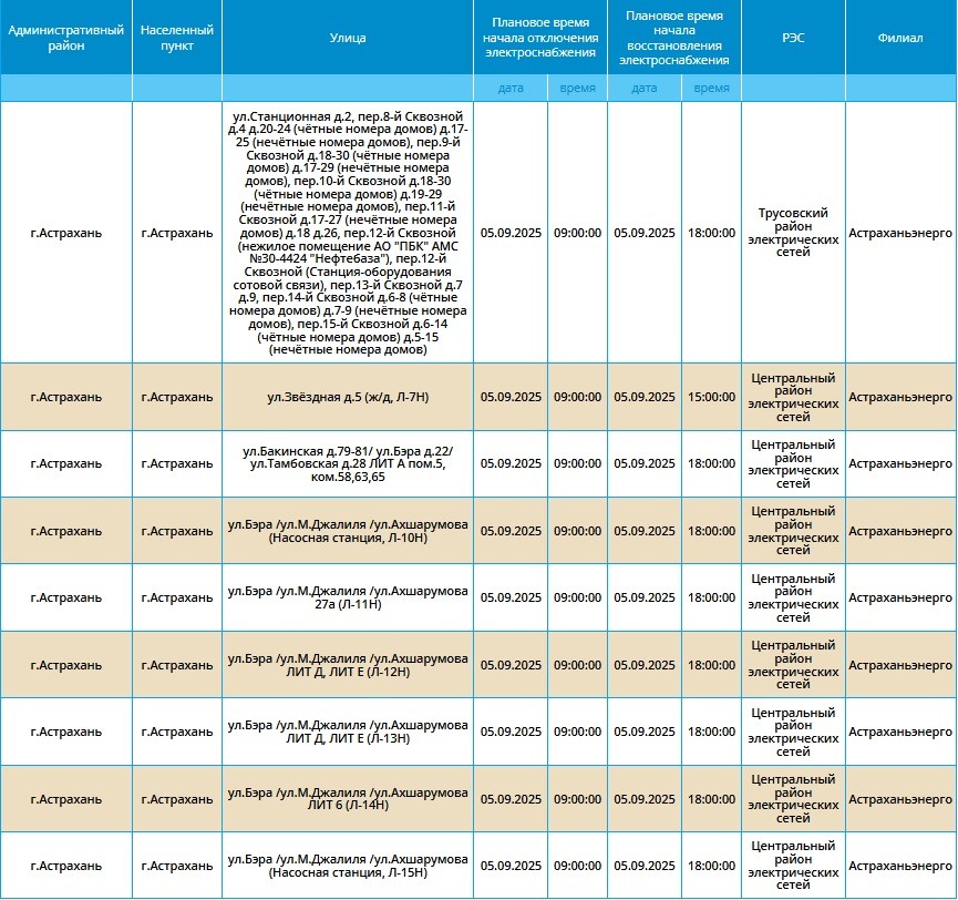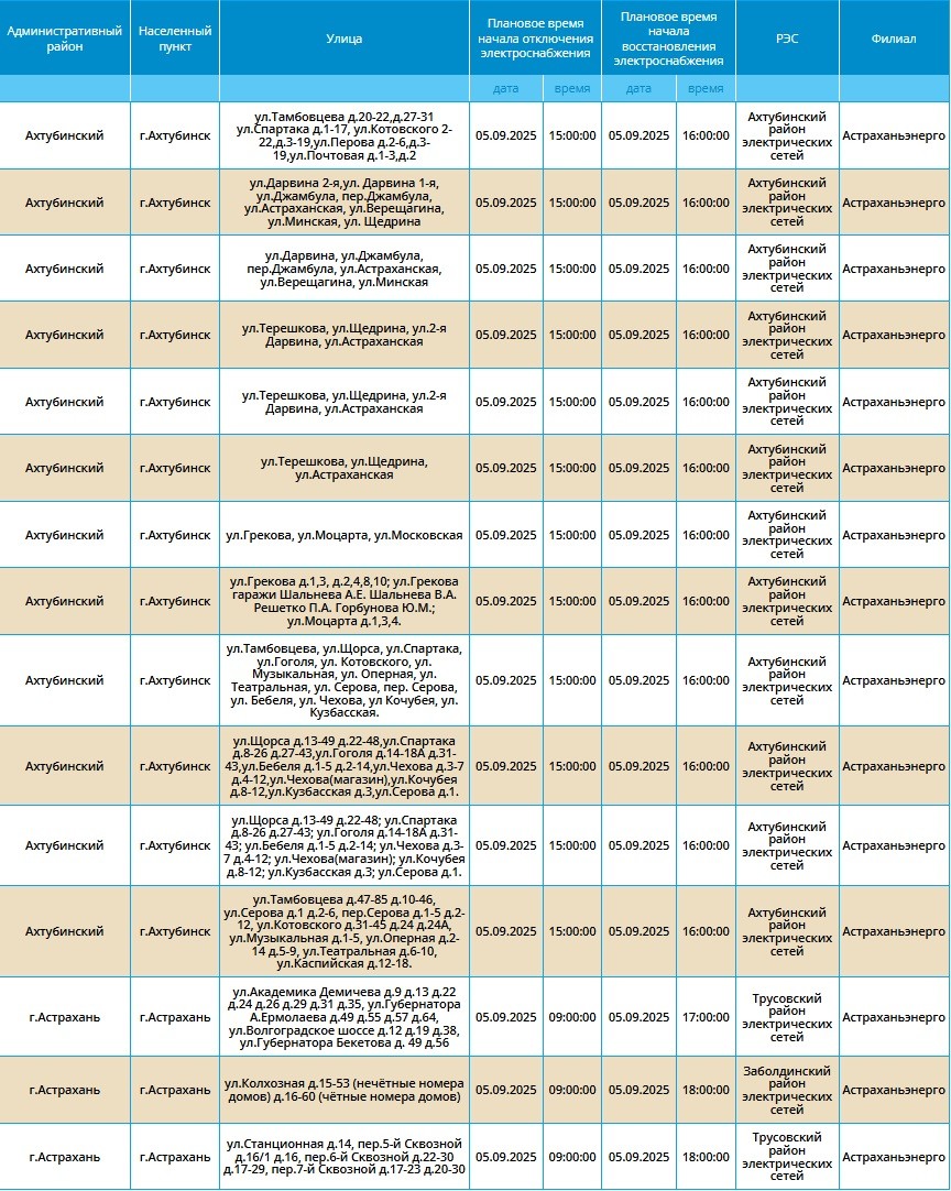 Завтра, 5 сентября, в Астрахани и по области вновь пройдут плановые отключения электроэнергии. Об этом сообщает ПАО «Россети Юг». Так, света не будет на некоторых улицах Астрахани, а также Ахтубинского района. Без электричества останутся котельная, насосная станция и школа. А если отключения произошли внепланово, звоните по телефонам, которые указаны ниже: