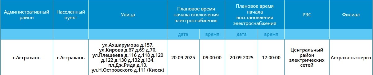 В эту субботу, 20 сентября, по нескольким адресам в городе Астрахань пройдут плановые отключения электроэнергии. Об этом сообщили в ПАО «Россети Юг». Без электричества останутся несколько домов в центральной части города. Подробнее со списком отключений можно ознакомиться ниже: Всю необходимую информацию о текущих коммунальных проблемах в нашем городе вы найдете на этой карте. Здесь оперативно обновляются данные о перебоях с электричеством, водоснабжением и прочими бытовыми неудобствами. При возникновении непредвиденных отключений обращайтесь по следующим номерам телефонов: