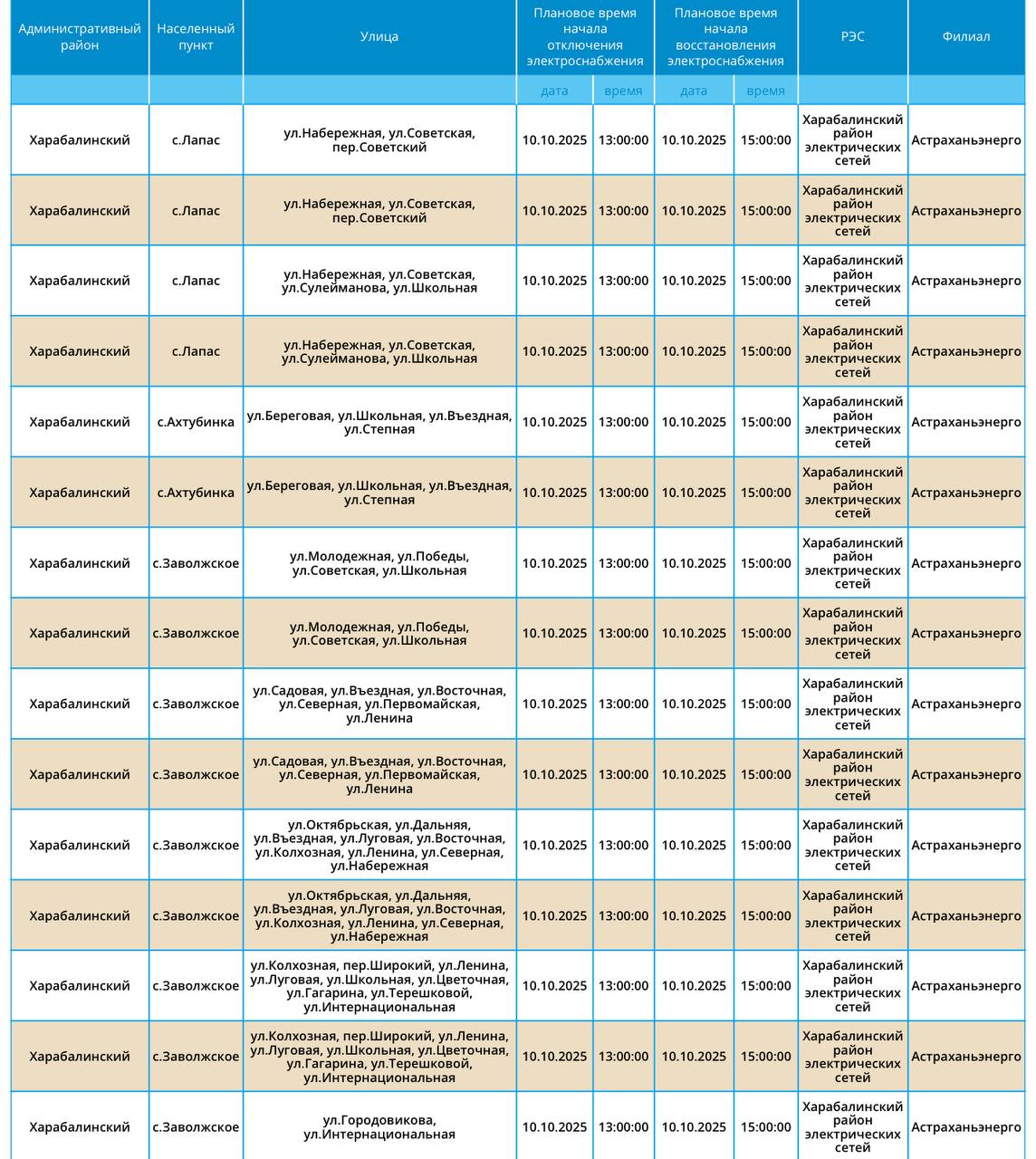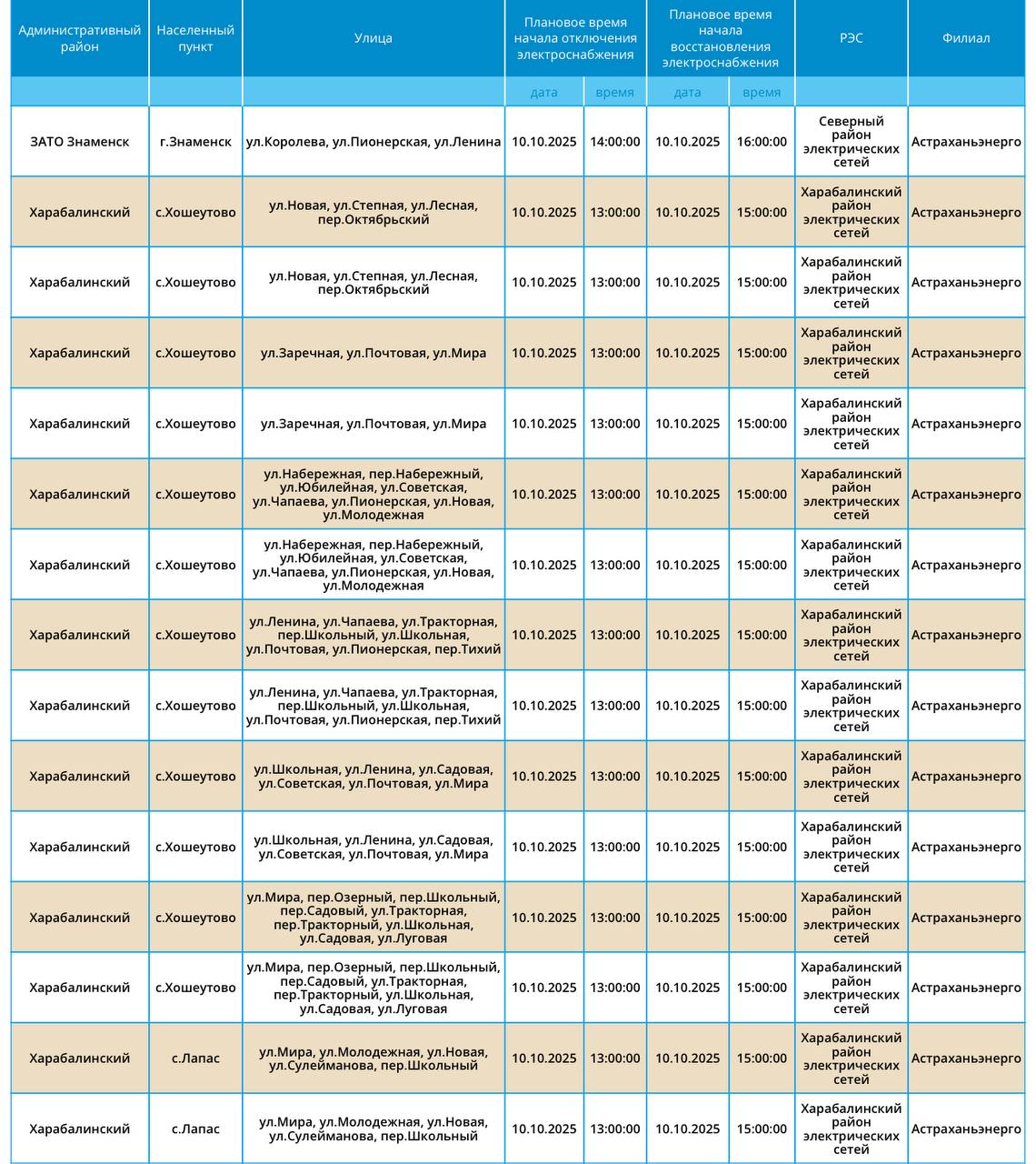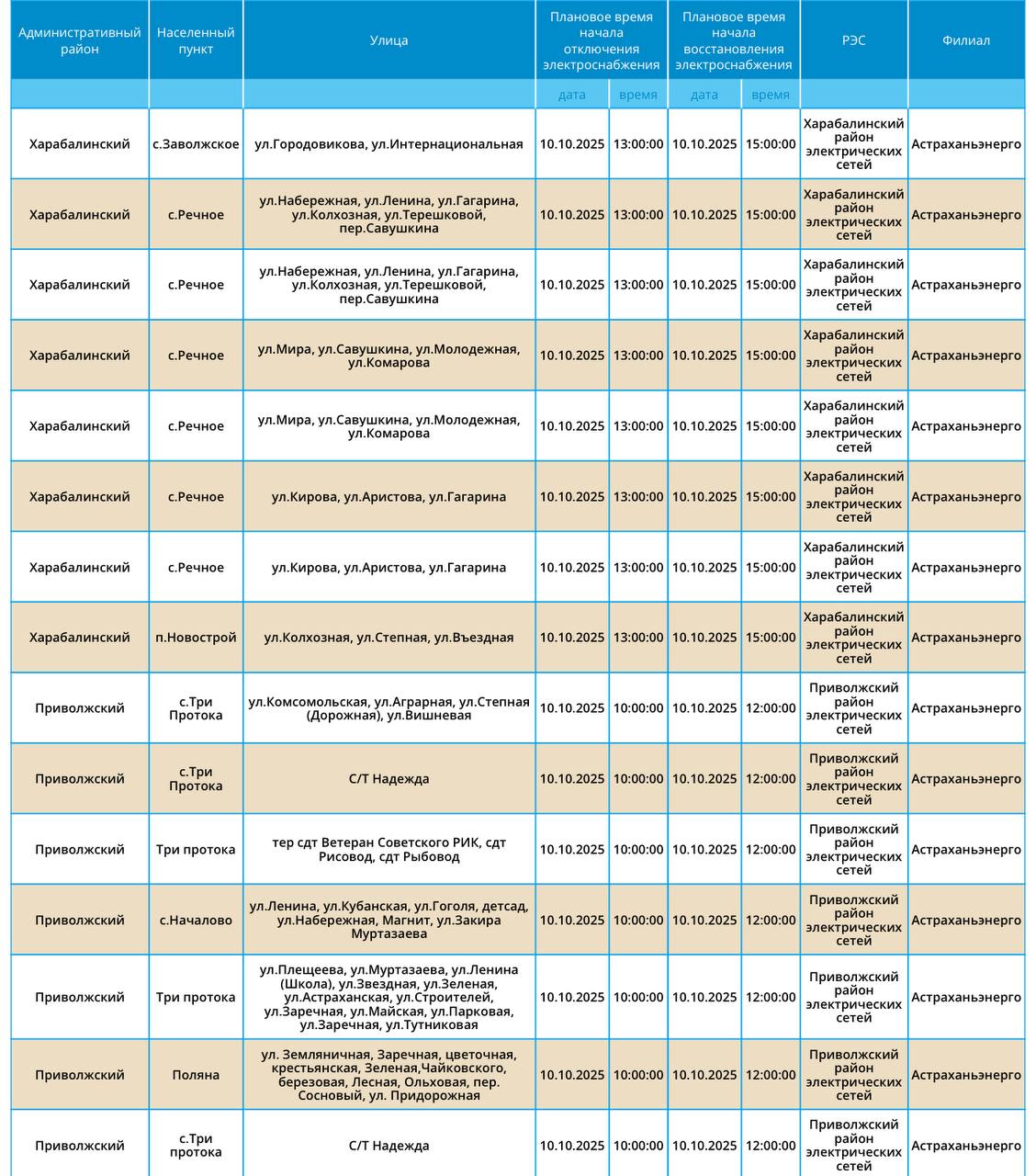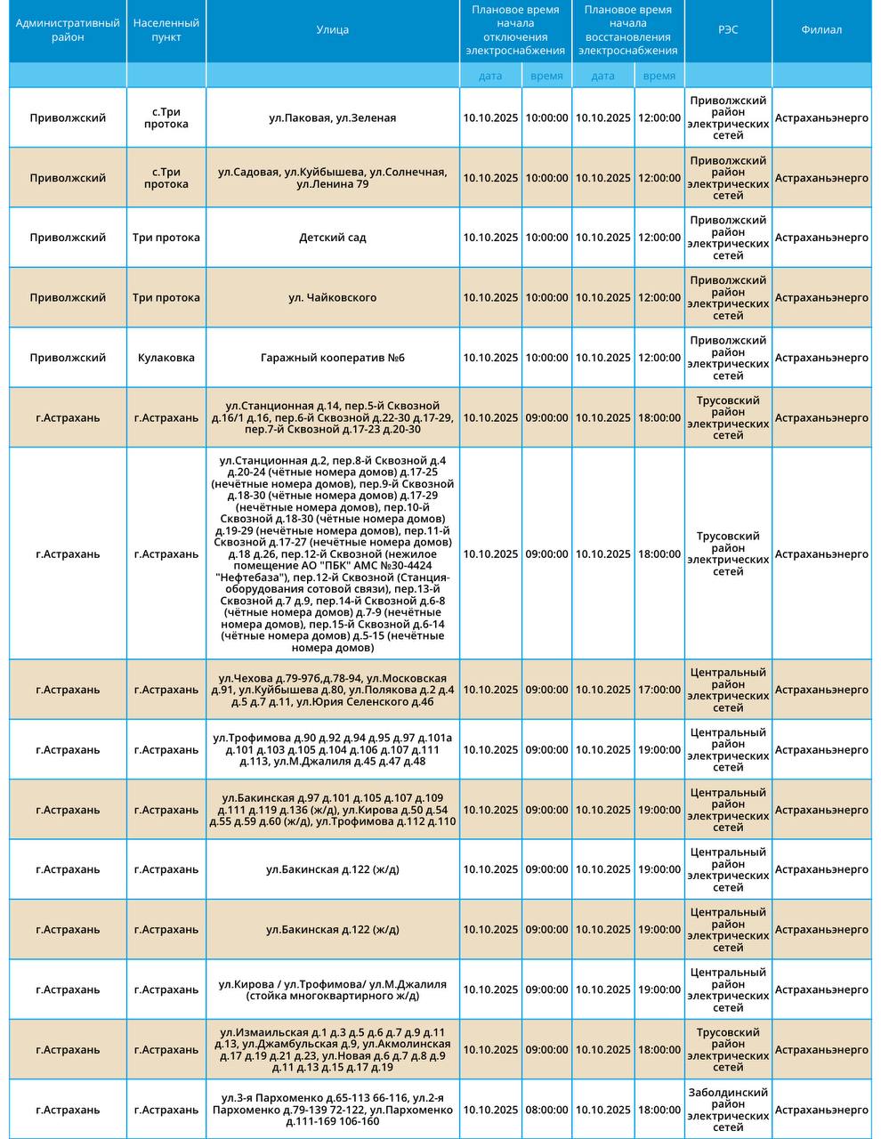 Завтра, 10 октября, в Астраханской области пройдут плановые отключения света. Об этом сообщили сотрудники ПАО «Россети Юг». Отключения коснутся как самого областного центра, так и ЗАТО Знаменск, Харабалинского и Приволжского районов. Подробнее со списком адресов можно ознакомиться на фото ниже: Все значимые данные о нынешних проблемах в сфере ЖКХ оперативно отображаются на специализированной онлайн-карте. Здесь регулярно публикуются уведомления о перебоях в энергоснабжении, водоснабжении и иных коммунально-бытовых неудобствах. В случае внеплановых отключений рекомендуется звонить по указанным номерам телефонов службы поддержки: