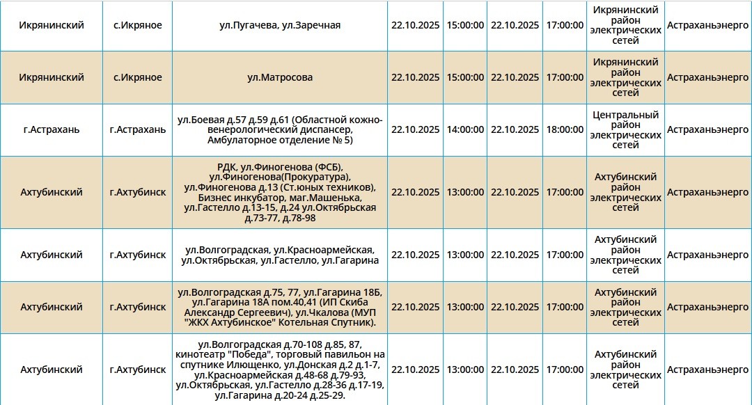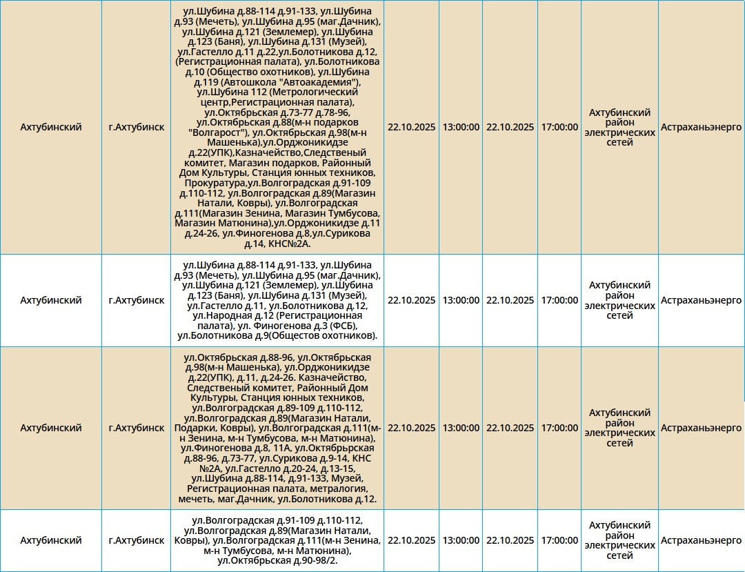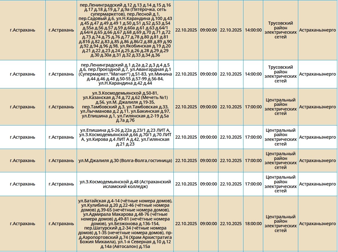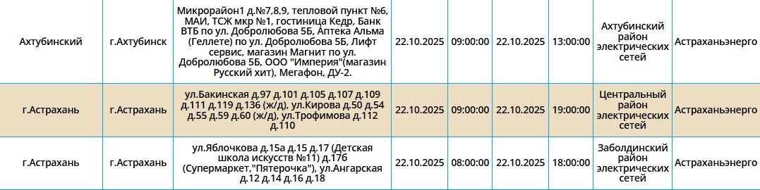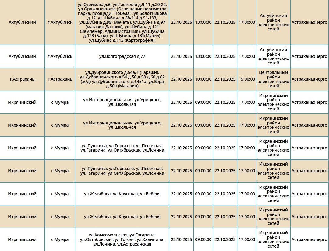Завтра в Астрахани и в области пройдут очередные плановые отключения электроэнергии. Об этом сообщает ПАО «Россети Юг». Так, света не будет на некоторых улицах Астрахани, а так же Ахтубинского и Икрянинского районов. Самые ранние отключения начнутся 08:00 и продлятся не менее 10 часов. Подробнее со списком отключений можно ознакомиться в галерее ниже: А информацию обо всех коммунальных проблемах нашего города вы можете найти здесь. На этом сайте, в режиме реального времени, вы можете наблюдать за отключениями света, воды и т.д. Если отключения произошли внепланово, звоните по телефонам, которые указаны ниже:
