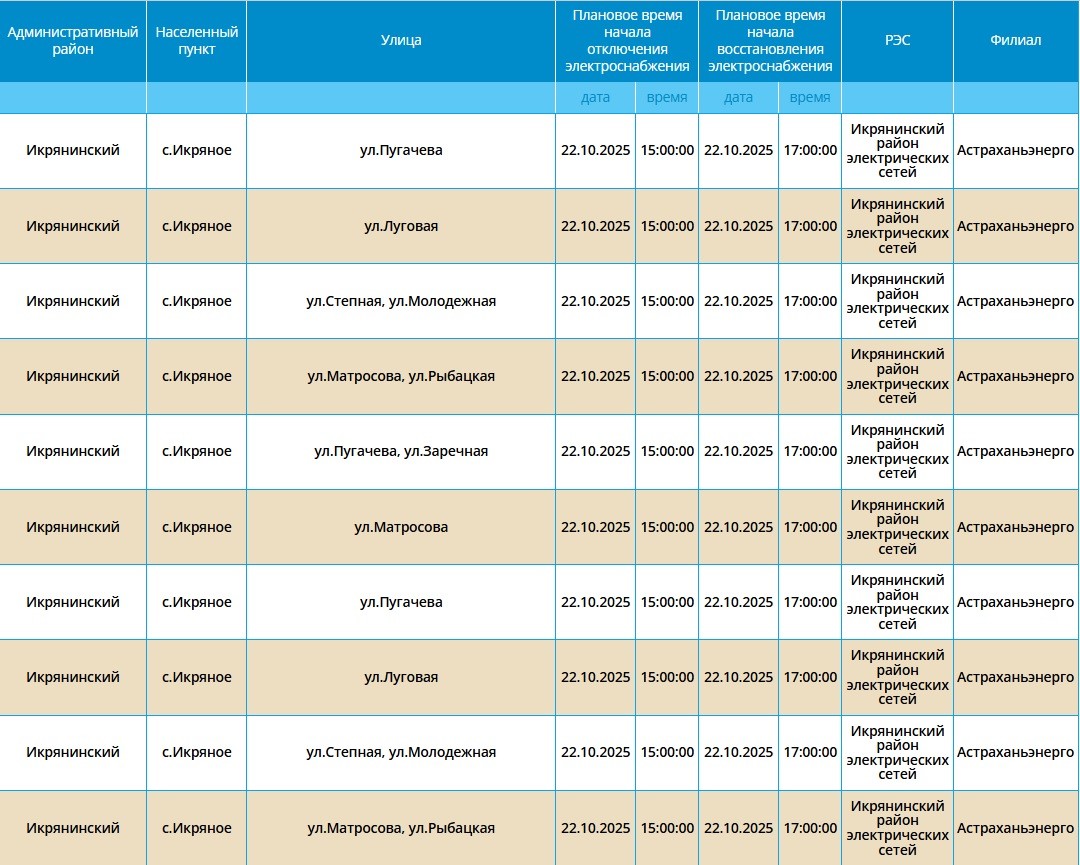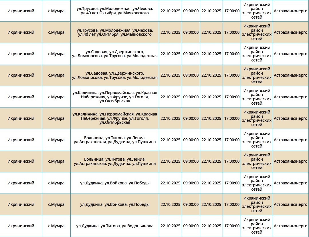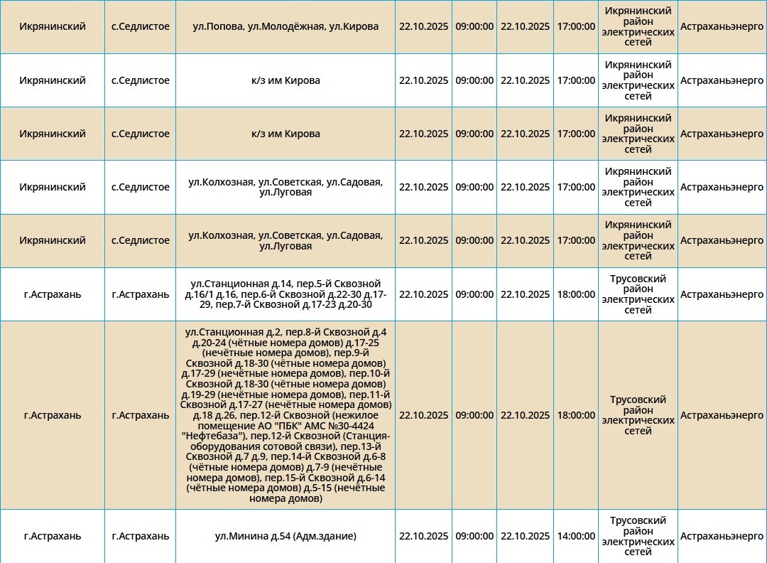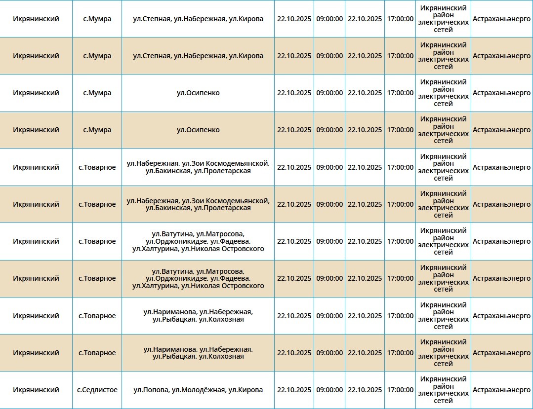 Завтра в Астрахани и в области пройдут очередные плановые отключения электроэнергии. Об этом сообщает ПАО «Россети Юг». Так, света не будет на некоторых улицах Астрахани, а так же Ахтубинского и Икрянинского районов. Самые ранние отключения начнутся 08:00 и продлятся не менее 10 часов. Подробнее со списком отключений можно ознакомиться в галерее ниже: А информацию обо всех коммунальных проблемах нашего города вы можете найти здесь. На этом сайте, в режиме реального времени, вы можете наблюдать за отключениями света, воды и т.д. Если отключения произошли внепланово, звоните по телефонам, которые указаны ниже: