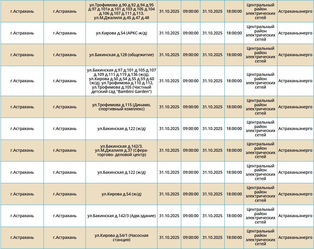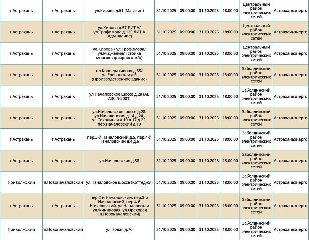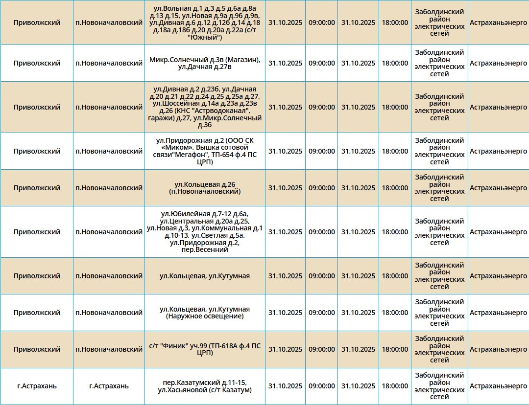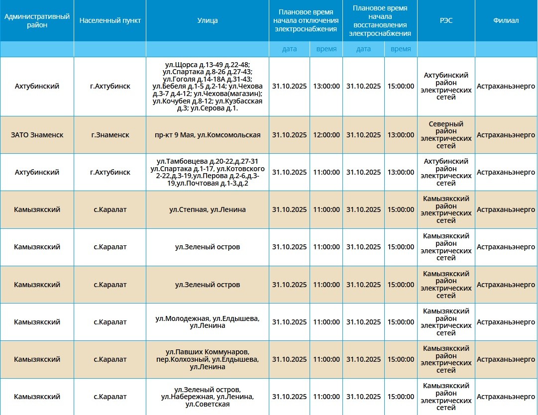 Завтра, 31 октября, в Астраханской области снова отключат электроэнергию. Отключения запланированные и проводятся для ремонтных работ на электросетях, сообщают в пресс-службе ПАО «Россети Юг». Так, без электричества останутся жители города Астрахань, а также Приволжского, Камызякского, Ахтубинского районов и ЗАТО Знаменск. Подробнее с адресами, по которым пройдут отключения, можно ознакомиться в галерее ниже: А информацию обо всех коммунальных проблемах нашего города вы можете найти на этой карте. Здесь, в режиме реального времени, вы можете наблюдать за отключениями света, воды и т.д. Если возникли незапланированные отключения, можно обращаться по указанным контактным телефонам: