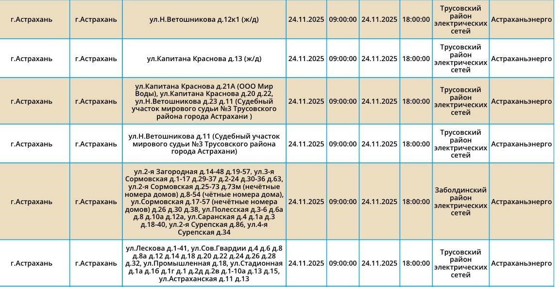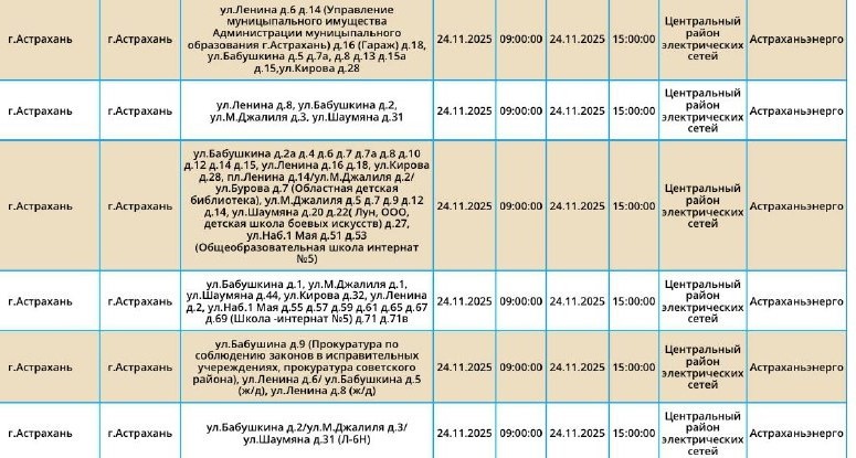 24 ноября продолжатся плановые отключения света, о которых местных жителей предупредили в ПАО «Россети Юг». Из-за работ на электросетях на несколько часов без электроэнергии останется часть абонентов в Астрахани и Икрянинском районе области. Более полный список адресов, попавших под отключения, можно увидеть здесь. Если отключение произошло вне планов, звоните по телефонам, которые указаны ниже: